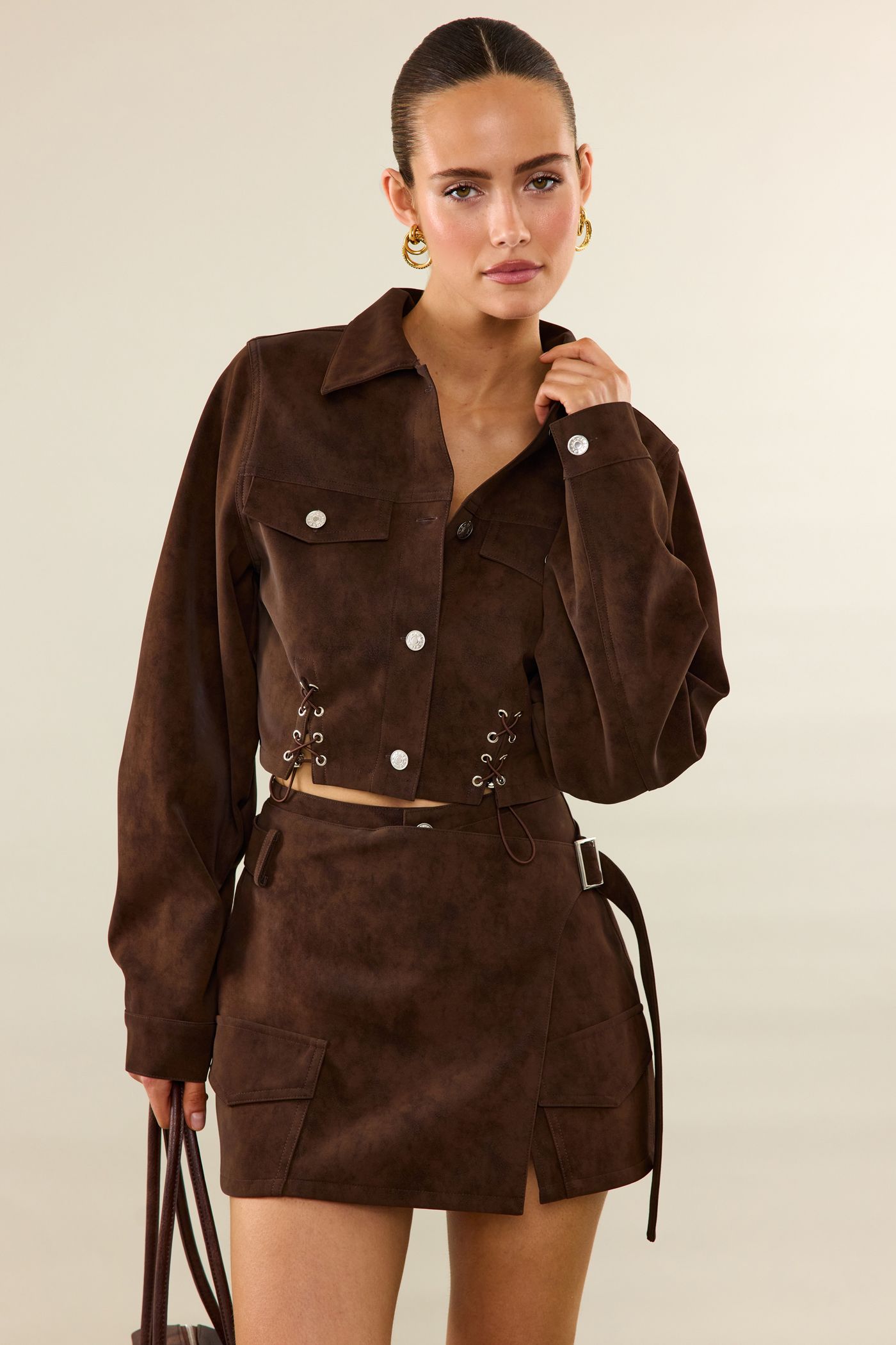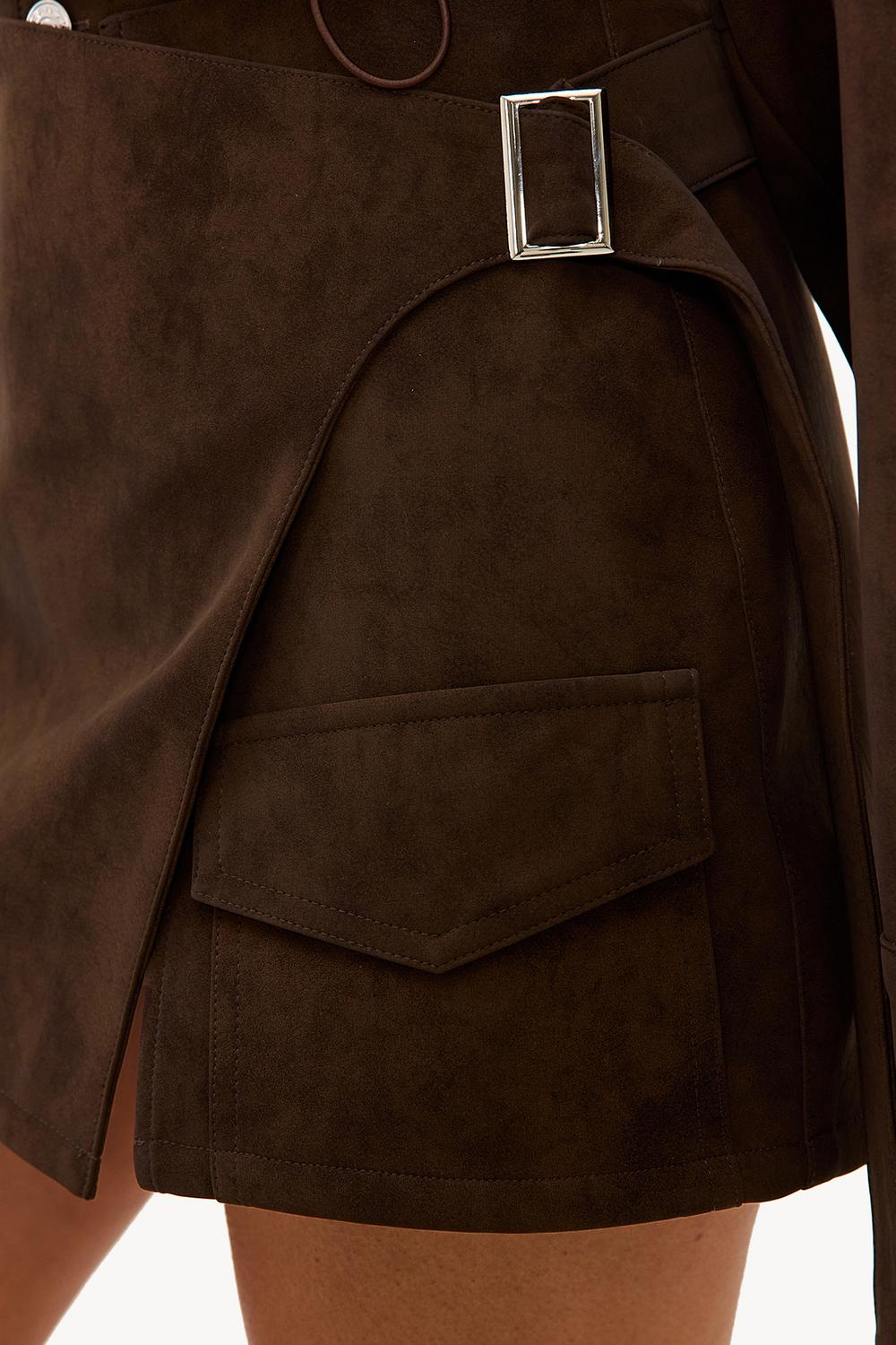 This brown skort features a luxurious suede-like texture with statement utility details. The wrap-style and integrated shorts create a playful look. The cargo pockets and belt give an edgy twist to this design. Style this skort with high boots for a cool look.