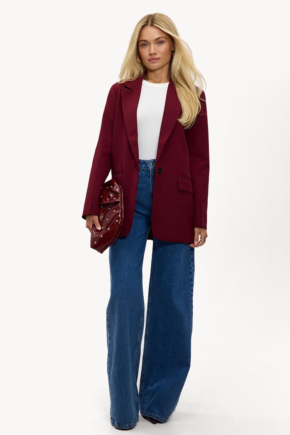 This burgundy blazer has a classic tailored fit with a statement oversized silhouette. The deep color and clean design with button closure ensure a timeless look. The extended fit with shoulder padding gives the blazer a modern twist. Style this blazer with wide-leg jeans for a chic casual look.