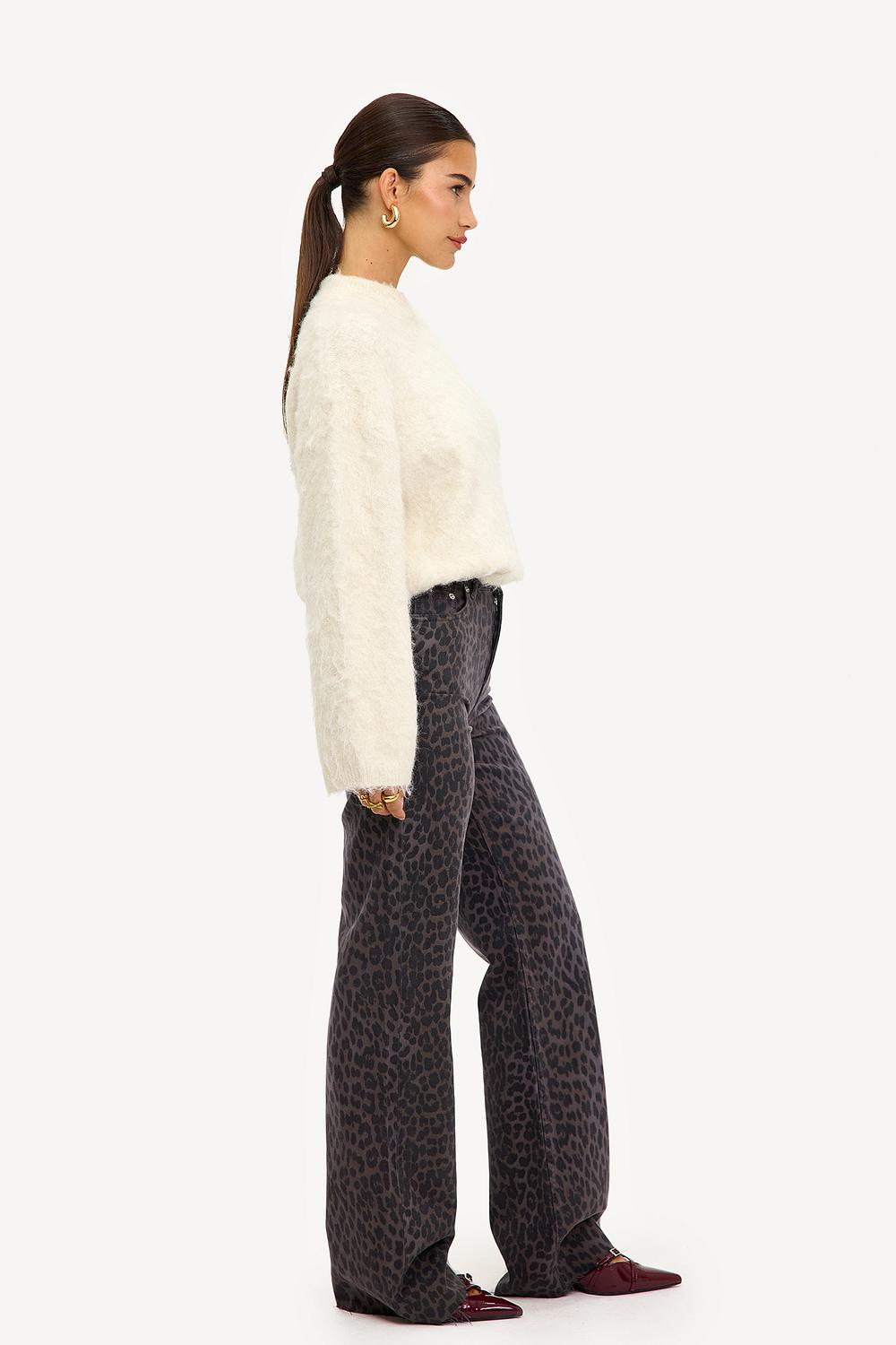 Grey wide leg jeans with leopard print EUR 59.99These jeans feature a wide leg fit, a button and zipper closure, side pockets, back pockets and a leopard print.