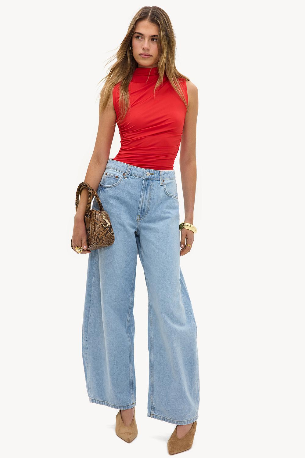 Red turtleneck top EUR 25.99This red turtleneck top features a bodycon fit with striking ruched details on the sides. The sleeveless design with a high neck creates a chic look. The stretch quality ensures comfort and a perfect shape. Style this top with high-waisted wide-leg jeans for a statement outfit.