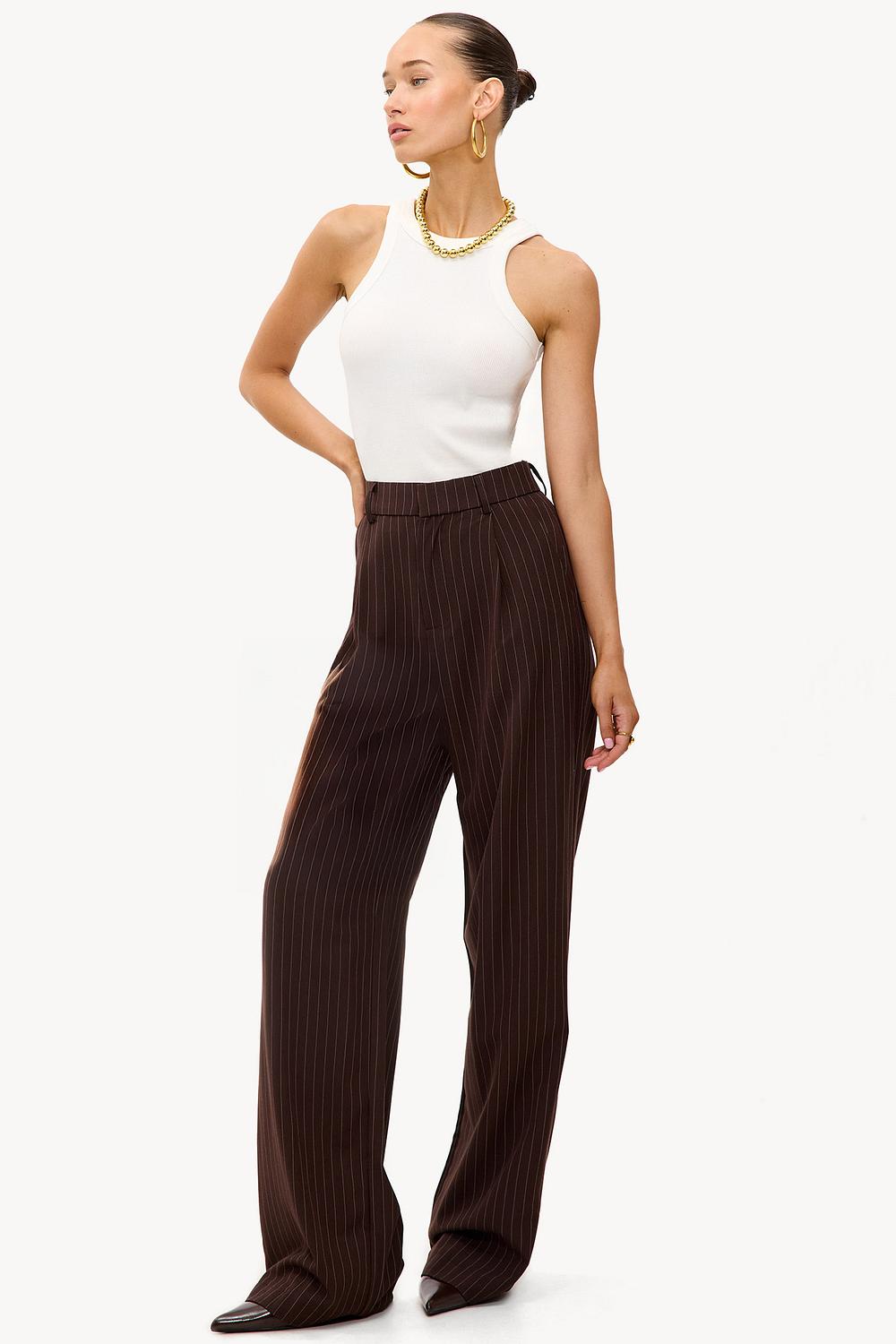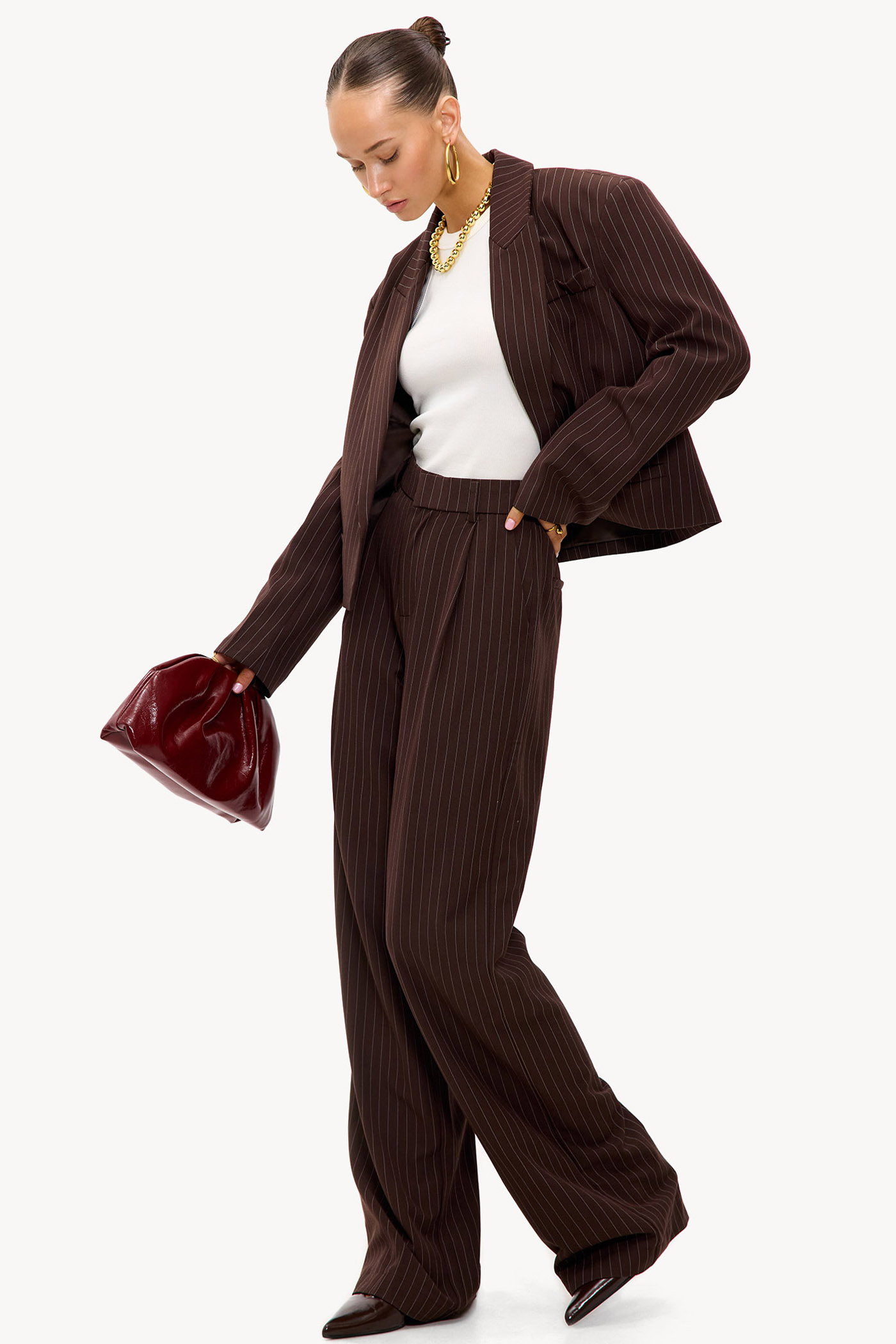 These dark brown wide-leg trousers feature a chic pinstripe pattern for a sophisticated look. The high-waisted fit with an elastic waistband ensures comfort and a flattering shape. The wide legs give these trousers a modern twist. Style these trousers with the matching blazer for a powerful co-ord look.