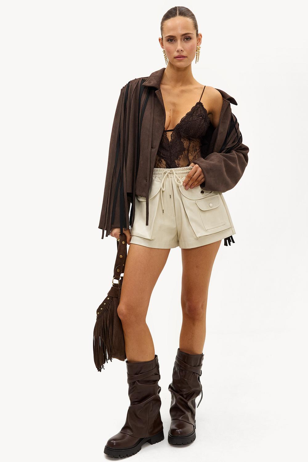 Dark brown lace bodysuit EUR 27.99This dark brown lace bodysuit features a luxurious all-over lace design with a deep V-neck and sheer mesh details. The spaghetti straps and statement cut-out at the waist create a refined look. The bodycon fit elegantly accentuates the shape. Style this bodysuit with high-waisted cargo shorts for an edgy contrast look.