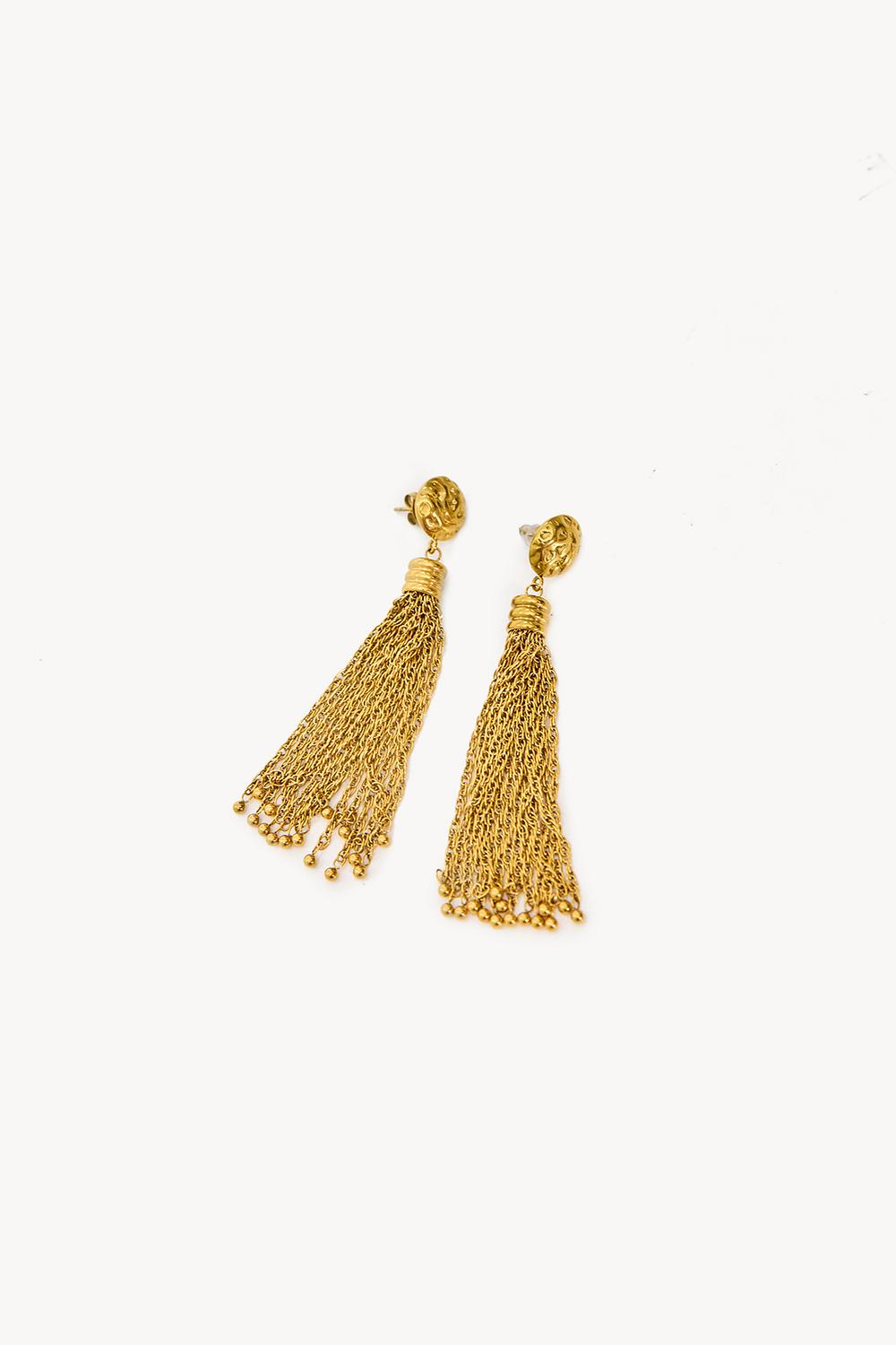 Golden earrings EUR 17.99These gold statement earrings feature striking tassel details for a luxurious look. The textured chain design with moving fringes creates a dynamic effect with every movement. The 100% stainless steel gold-plated quality ensures durability and a beautiful golden finish.
