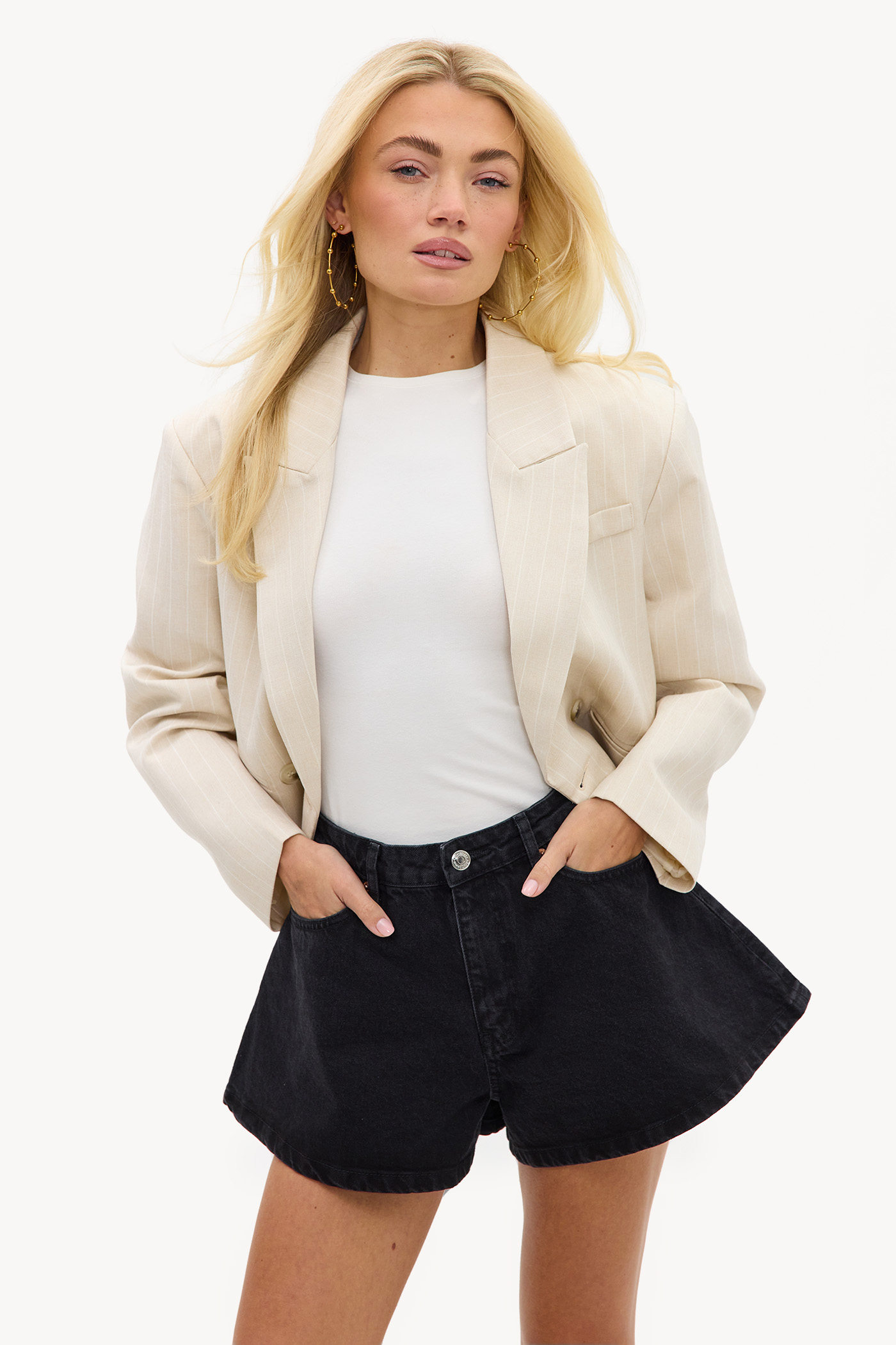 Black denim shorts EUR 39.99These black denim shorts feature a vintage used wash with classic 5-pocket details. The high-waisted fit with wide legs creates a relaxed look that is perfect for casual days. The 100% cotton quality ensures comfort and durability. Style these shorts with an oversized blazer and boots for a chic contrast look.