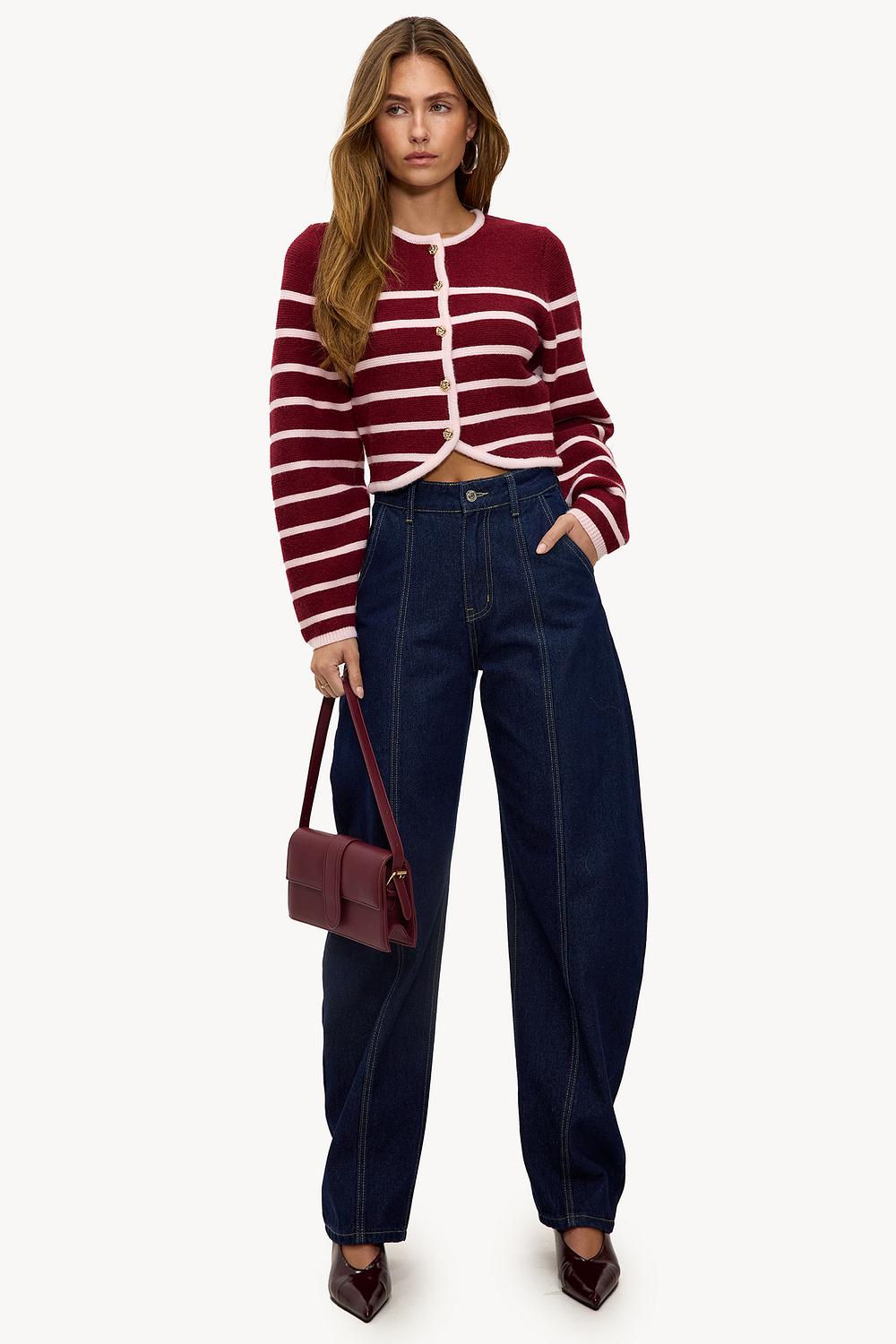 This burgundy cardigan features a classic striped design with contrasting light pink stripes. The cropped fit with gold statement buttons and ribbed trims creates a chic twist on the timeless cardigan design. The fitted cut elegantly accentuates the shape. Style this cardigan with high-waisted jeans for a casual chic look.