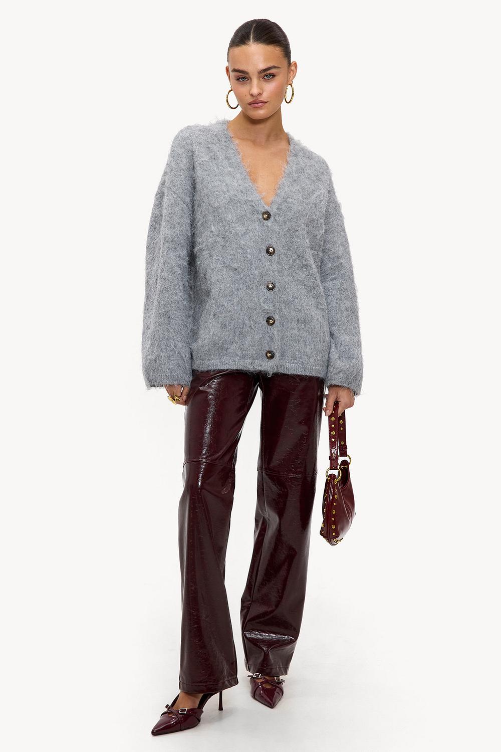 This grey knit cardigan features a soft fuzzy texture with a deep V-neck and statement buttons. The oversized fit with long sleeves creates a cool casual look. The wool blend provides extra comfort and warmth. Style this cardigan open over a basic top with leather-look pants for a chic contrast.