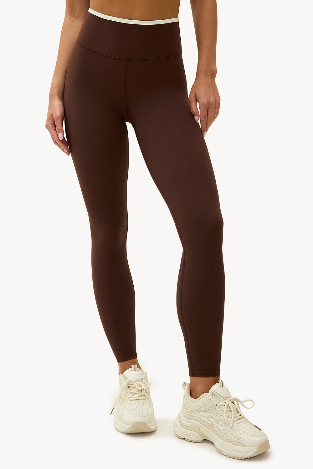 Dark brown sport leggings EUR 29.99This dark brown sports leggings with a high-waisted fit and white contrast details at the waistband accentuates your shape in a modern, sporty way. The stretchy polyester and elastane mix ensures optimal freedom of movement during pilates, yoga, fitness, running, lounging, or a coffee run. The bodycon fit with contrasting accents creates a sleek, sporty look. Wear with the matching crop top for a complete co-ord or mix & match for your favorite aesthetic vibes.