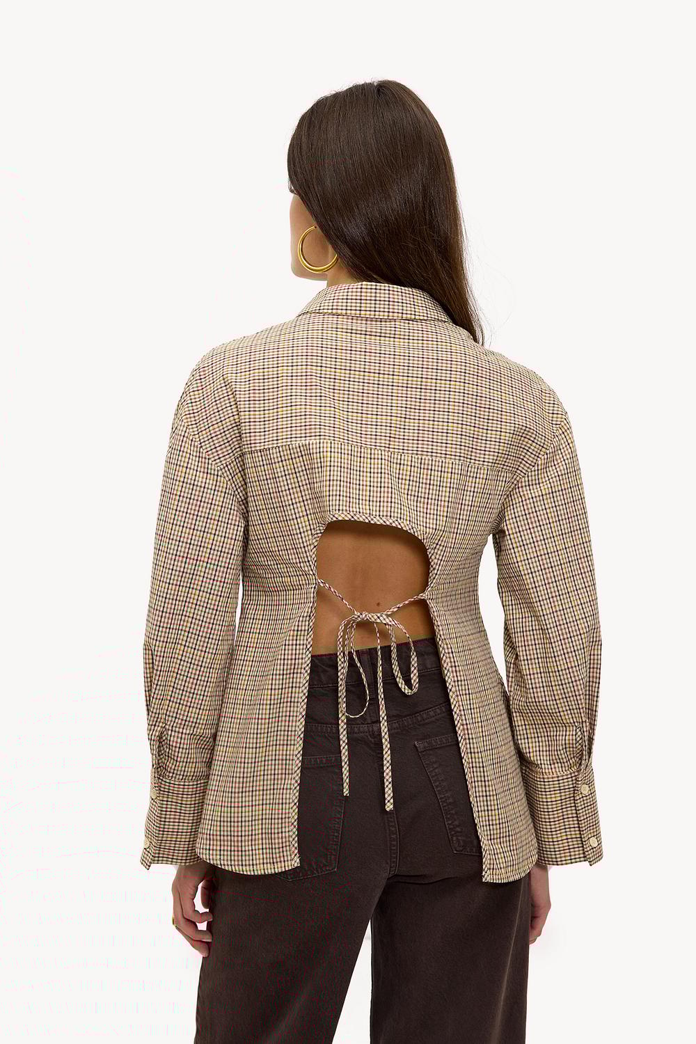 Sand-colored checked blouse with open back EUR 49.99This sand-colored button blouse features a classic check print and striking cut-out details on the back. The oversized fit with statement balloon sleeves and button closure creates a modern twist on the timeless shirt design. The 100% cotton ensures comfort and a luxurious appearance. Style this blouse with wide-leg jeans for a chic casual look.