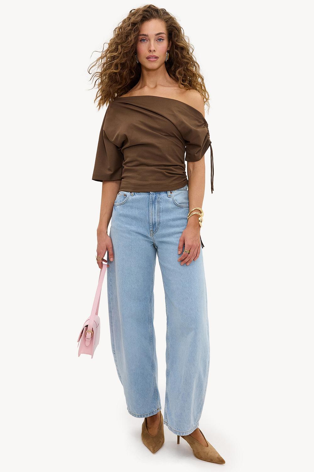 Brown top EUR 29.99This brown off-shoulder top features a statement asymmetrical fit with ruched details on the side. The draped fit with adjustable drawstrings creates a modern twist on the classic off-shoulder design. The 100% cotton quality ensures comfort and a luxurious appearance. Style this top with wide-leg jeans for a casual chic look.