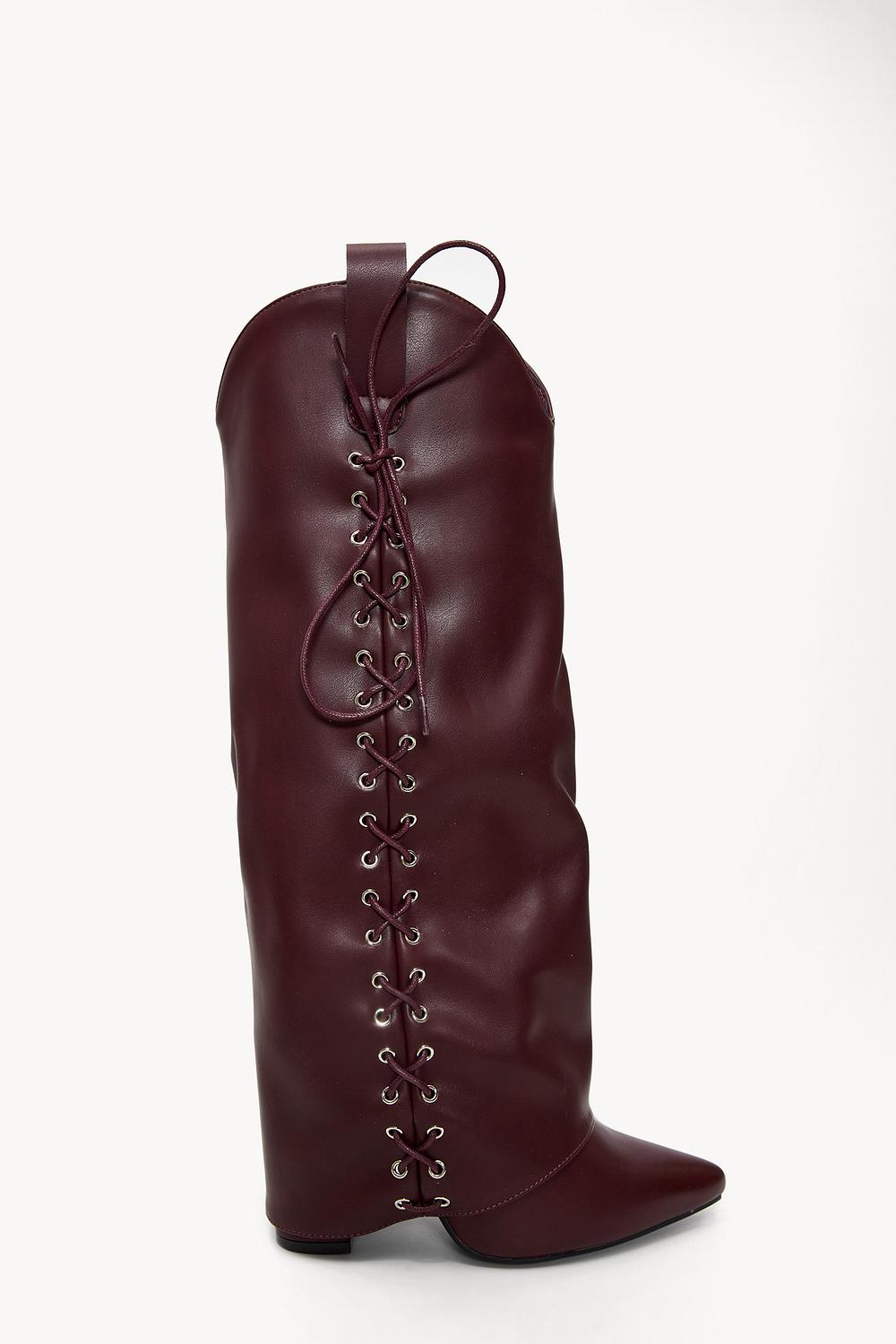 These burgundy knee-high boots feature striking lace-up details on the side for an edgy western look. The pointed toe and high shaft create a statement appearance that perfectly matches current trends. The vegan leather finish provides a luxurious look and sustainable choice. Style these boots with an oversized blazer and mini shorts for a cool contrast look.