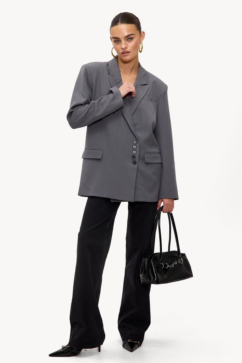 This gray oversized blazer features a tailored double-breasted design with statement buttons at the front. The long fit with classic lapels and pockets creates a chic business look. Style this blazer with black wide-leg trousers for office days or wear it over a basic top for a casual chic outfit.