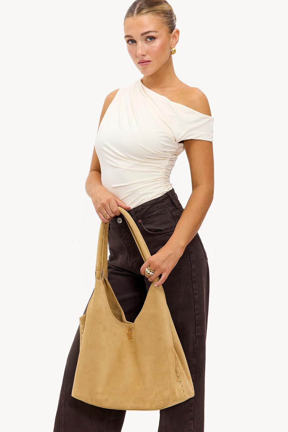Light brown bag EUR 39.99This camel suede-like tote bag has a spacious shape with statement stud details on the side. The soft texture and warm color give this bag a luxurious look. The comfortable handles and gold hardware make this the perfect everyday bag for all your essentials.