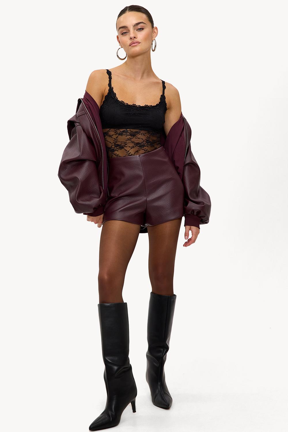 This black bodysuit features a luxurious combination of lace and sheer mesh for a statement look. The cups with scalloped lace details and the sheer center panel create a modern twist. The straps with ruffle details add an extra feminine touch. Style this bodysuit with a leather-look mini skirt for a girls' night out look.