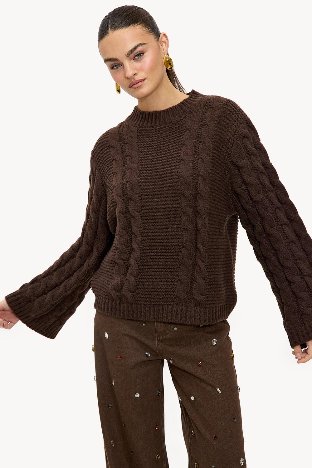 This brown knit jumper features a luxurious cable knit design with striking braided details. The oversized fit with ribbed cuffs creates a comfy look for cooler days. Style this jumper with the matching wide-leg trousers for a stunning co-ord look.