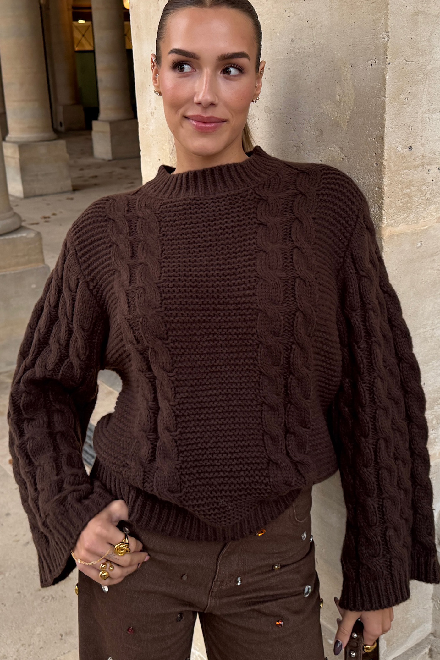 Brown knitted cable sweater EUR 59.99This brown knit jumper features a luxurious cable knit design with striking braided details. The oversized fit with ribbed cuffs creates a comfy look for cooler days. Style this jumper with the matching wide-leg trousers for a stunning co-ord look.