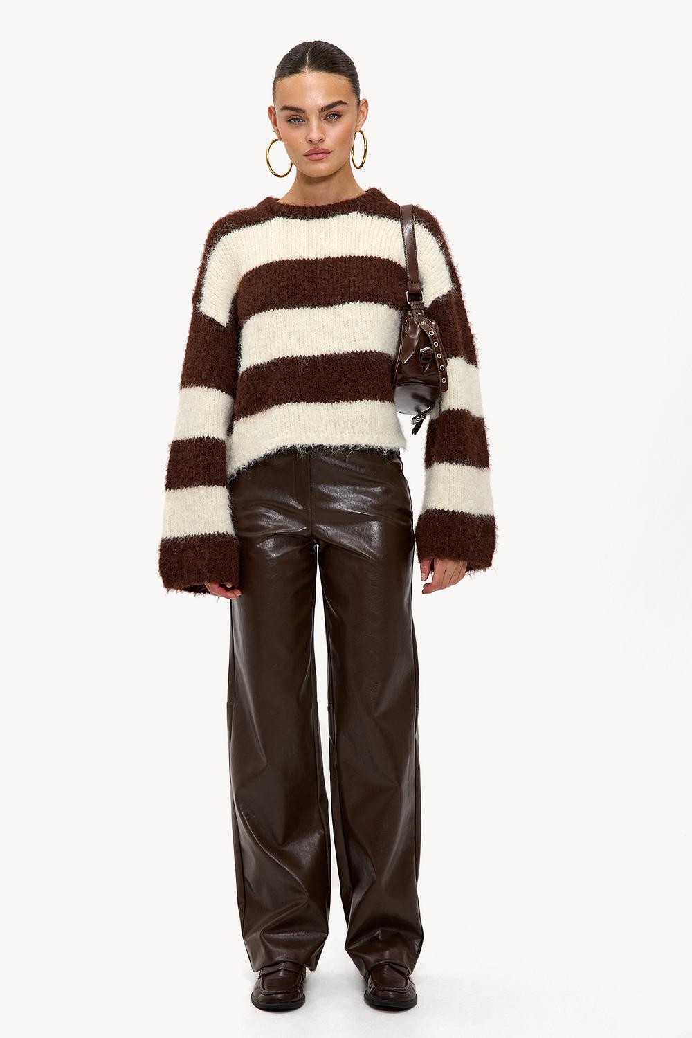 Brown PU pants EUR 59.99These dark brown wide-leg trousers have a luxurious leather-look finish for a statement appearance. The high-waisted fit with straight wide legs creates a modern shape that perfectly aligns with current trends. The 5-pocket styling with button closure gives these vegan leather trousers a classic denim twist. Style these trousers with a crop top and statement accessories for an edgy city look.