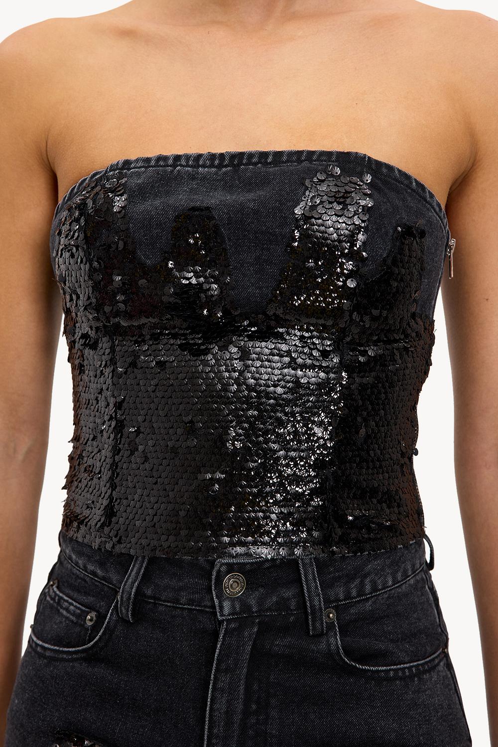Black strapless sequin top EUR 39.99This black strapless top features a striking sequin design all over for a statement look. The bodycon fit with a strapless cut accentuates the shape in a modern way. The 100% cotton ensures comfort while the shiny sequins provide a luxurious appearance. Style this top with the matching sequin jeans for a stunning co-ord look during a girls' night out.