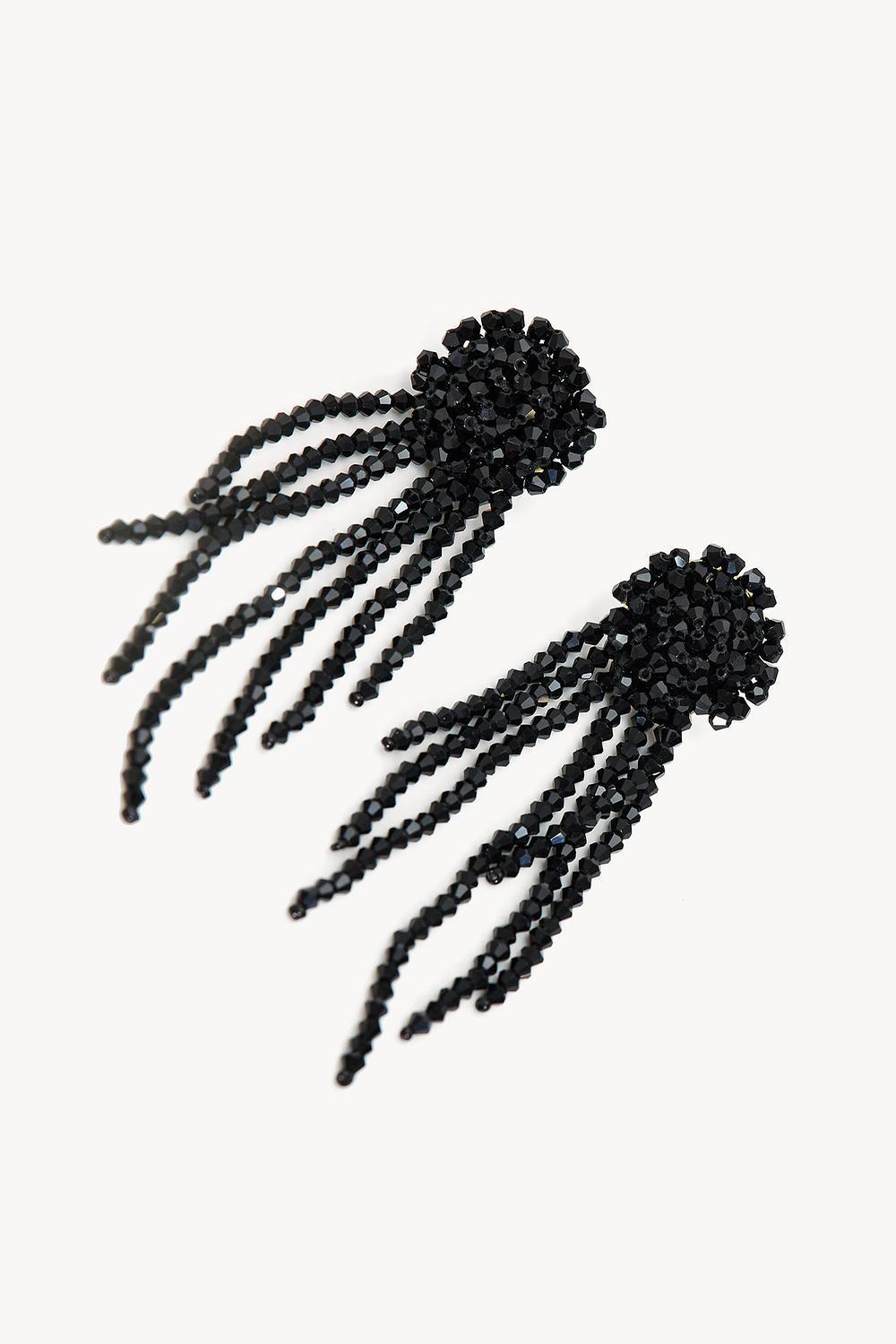 Black beaded earrings EUR 17.99These black statement earrings feature striking beaded fringes that move elegantly with every step. The beaded top creates a dramatic effect that is perfect for evening looks. The long dangling shape adds instant glamour to your outfit. Style these earrings with a strapless top for a stunning party look.