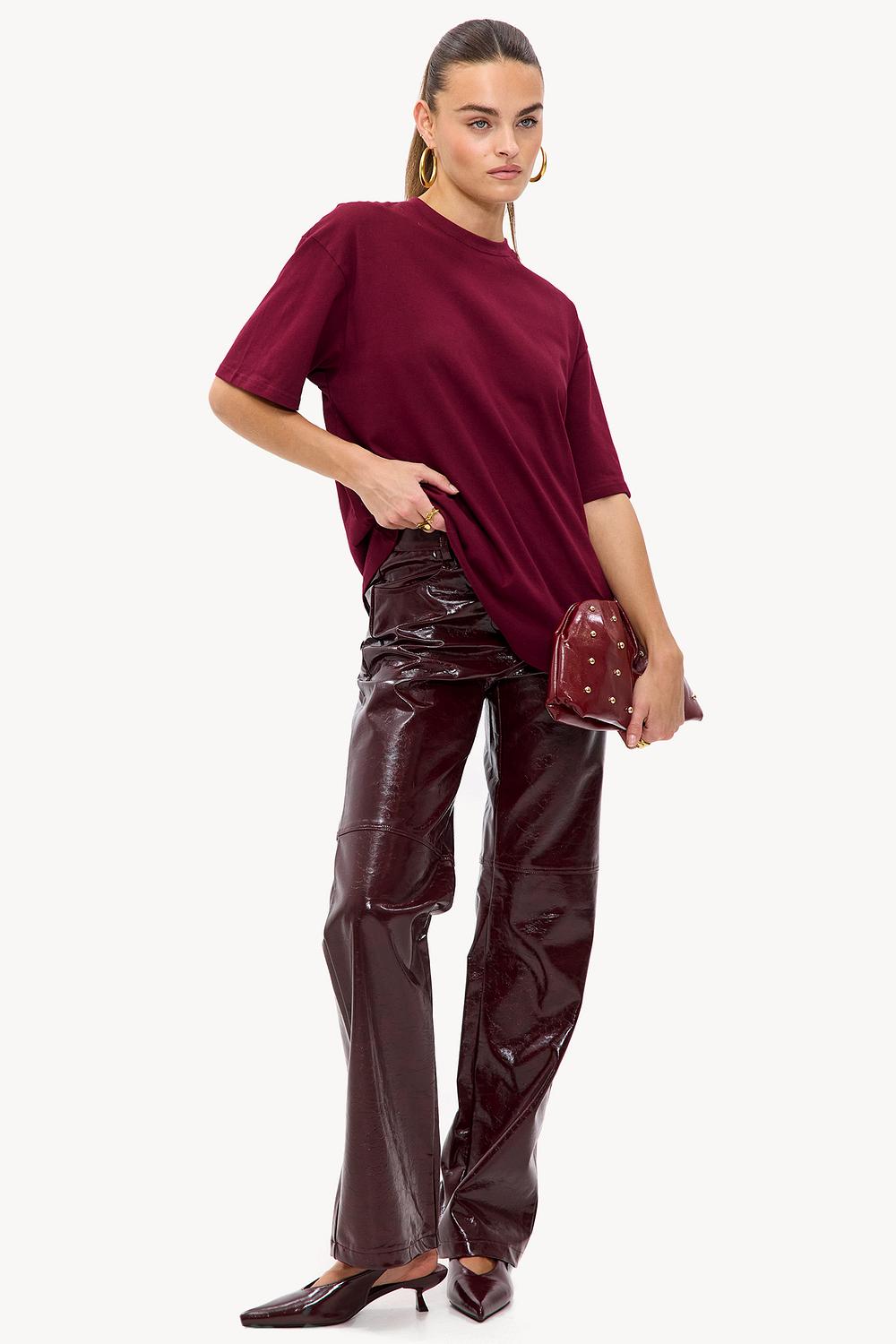 This burgundy oversized T-shirt features a relaxed fit with short sleeves for a comfortable look. The 100% cotton quality ensures a soft wearing experience and durability. The basic round neck and loose fit make this shirt perfect for casual styling. Style this T-shirt with a leather-look mini skirt and statement earrings for a chic contrast.