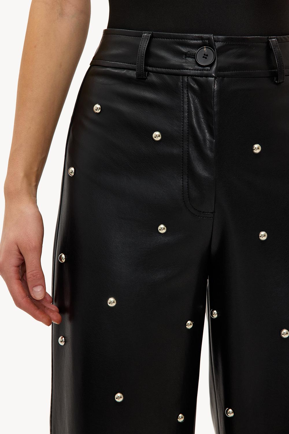 Black PU pants with studs EUR 59.99These black leather-look straight pants feature striking studs all over for an edgy statement look. The high-waisted fit with straight legs and tailored details creates a modern rock-chic appearance. The vegan leather material gives the pants a luxurious finish. Style these pants with a black crop top and oversized blazer for an iconic girls' night out look.