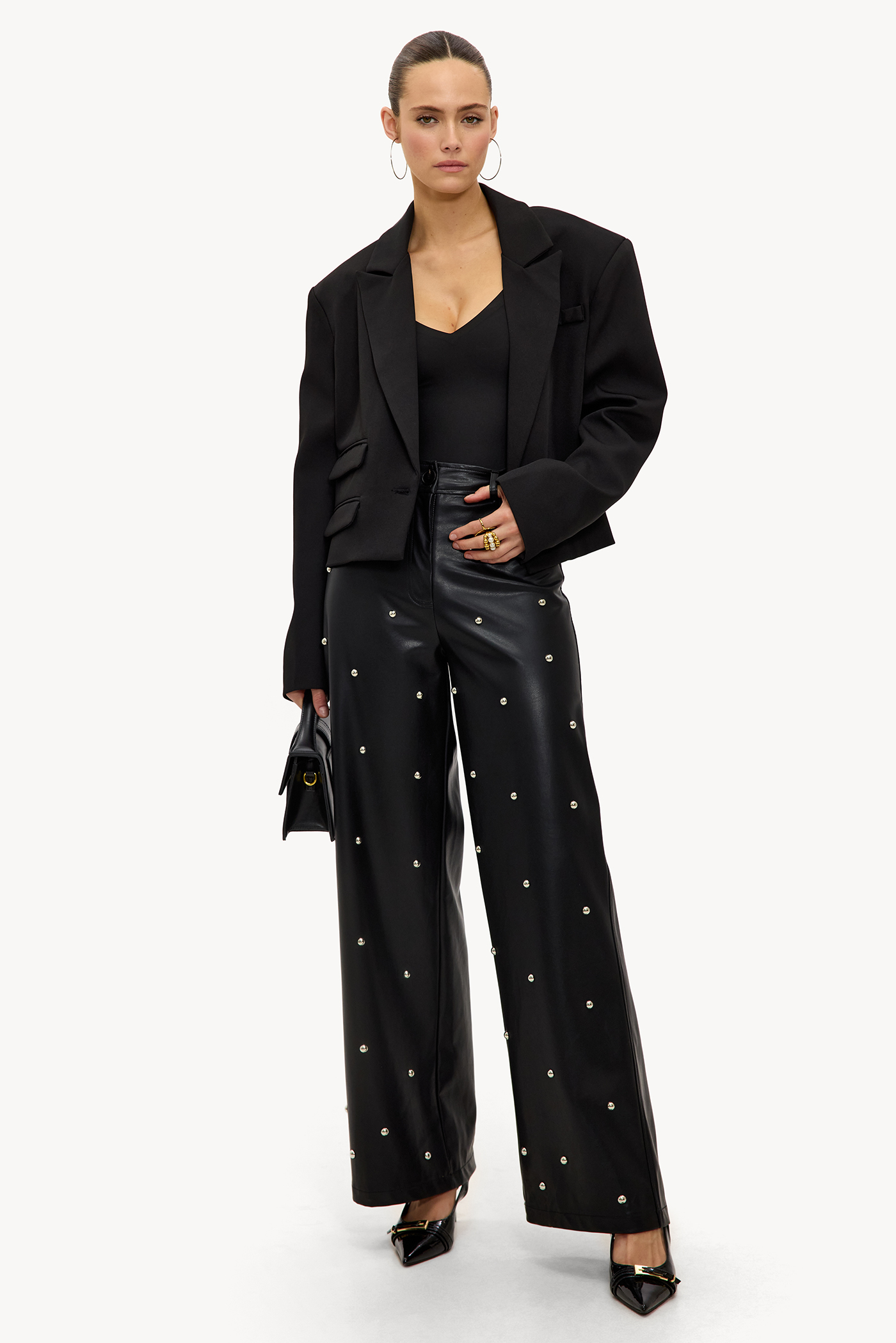 Black PU pants with studs EUR 59.99These black leather-look straight pants feature striking studs all over for an edgy statement look. The high-waisted fit with straight legs and tailored details creates a modern rock-chic appearance. The vegan leather material gives the pants a luxurious finish. Style these pants with a black crop top and oversized blazer for an iconic girls' night out look.