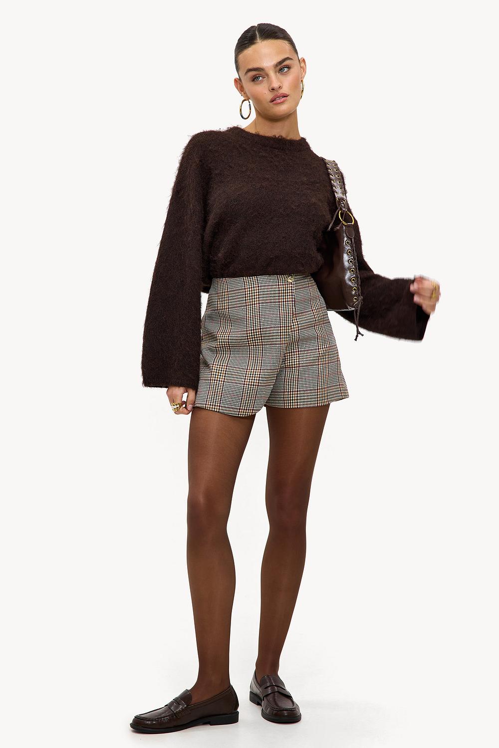 Beige skort with checkered print EUR 49.99This beige skort features a classic check pattern for a timeless look. The short skirt with integrated shorts combines comfort with style through the tailored fit. The gold statement button at the front adds a luxurious accent to the design. Style this skort with an oversized knit sweater for a chic casual outfit.