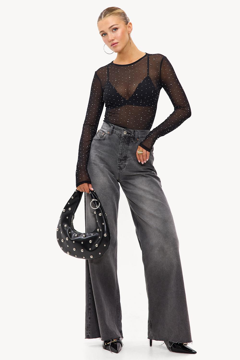Black top with studs EUR 21.99This black mesh top features a transparent overlay with shiny studs all over for a statement look. The fitted design with long sleeves creates an edgy twist on the classic mesh design. The subtle transparency combined with the metallic details ensures a cool party-ready appearance. Style this top with high-waisted jeans for an iconic girls' night out look.