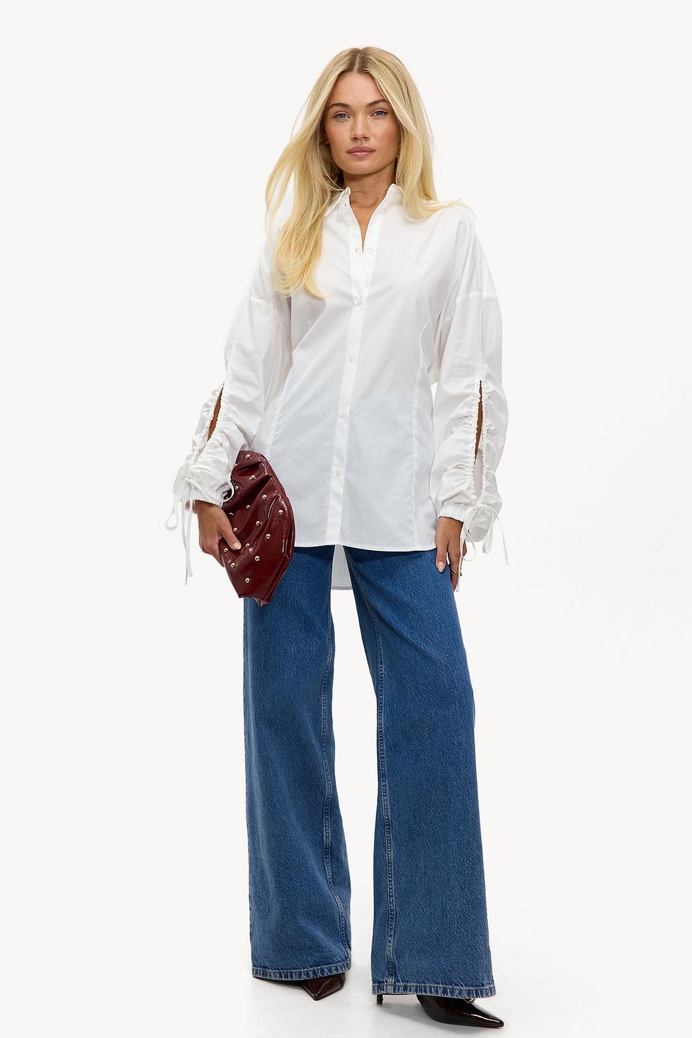 White blouse EUR 49.99This white blouse has an oversized fit with statement cut-out sleeves for a modern twist. The button closure and classic collar provide a chic base, while the striking bow details on the sleeves offer a cool update. The loose fit creates a relaxed look that pairs perfectly with wide leg jeans.