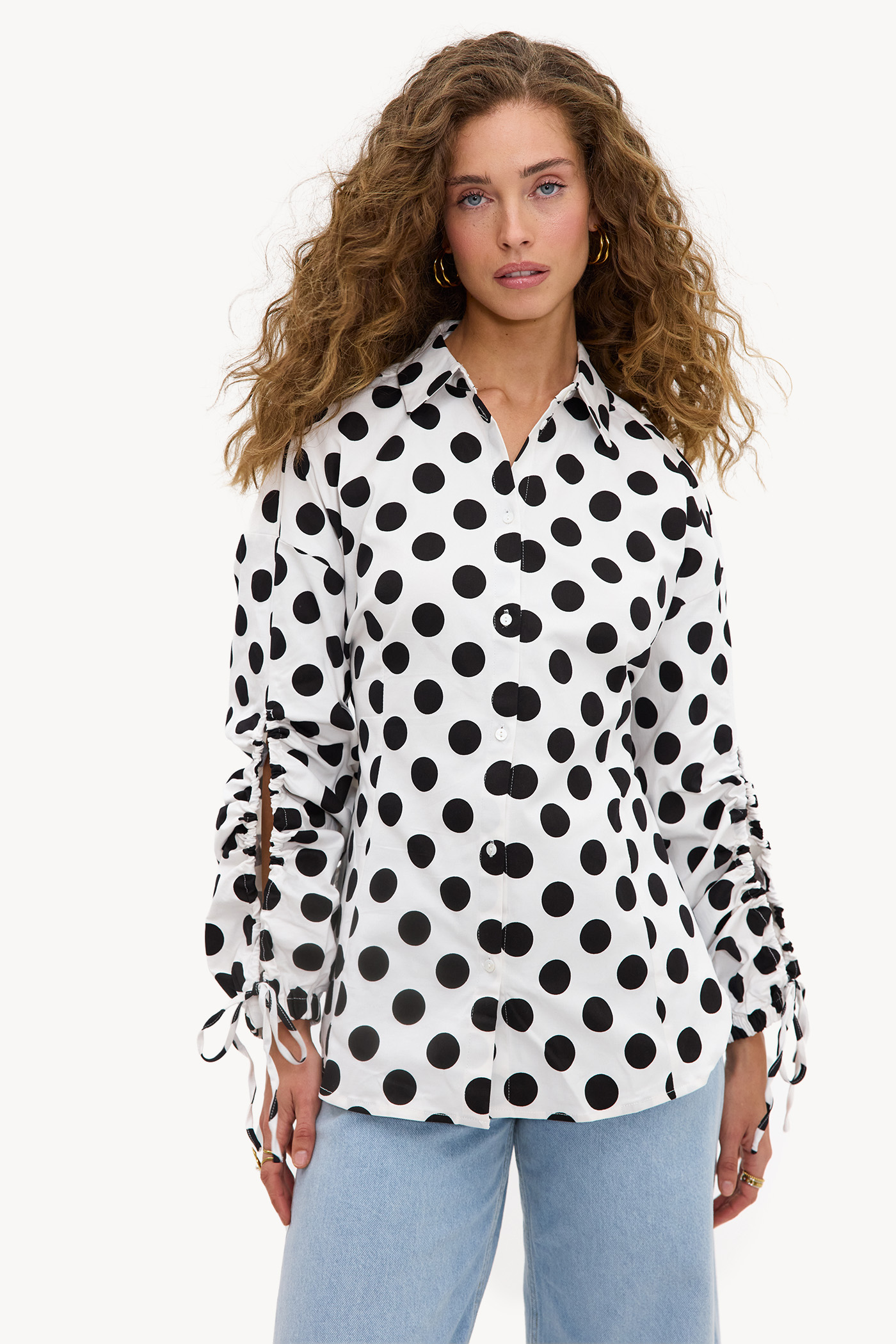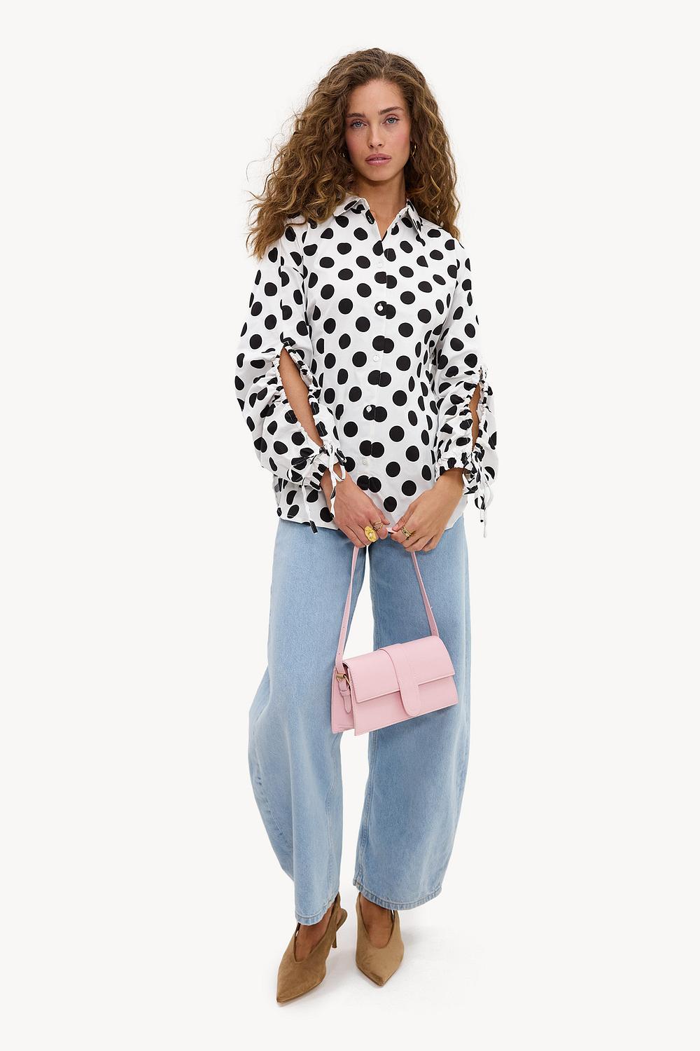 White blouse with dots EUR 49.99This white blouse features a striking polka dot print all over for a statement look. The oversized fit with button closure and tie details on the sleeves give this blouse a modern twist. The cotton quality ensures comfort and a luxurious appearance. Style this blouse with wide leg jeans for a chic casual look.