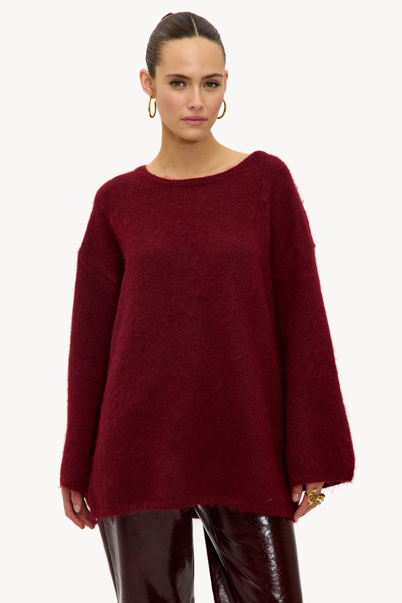 Bordeaux sweater EUR 49.99This burgundy knit jumper has a luxurious soft texture and oversized fit for ultimate comfort. The off-shoulder design with a relaxed fit creates an effortless chic look. The wool blend ensures a warm and high-quality finish. Style this jumper with leather-look trousers for a statement outfit.