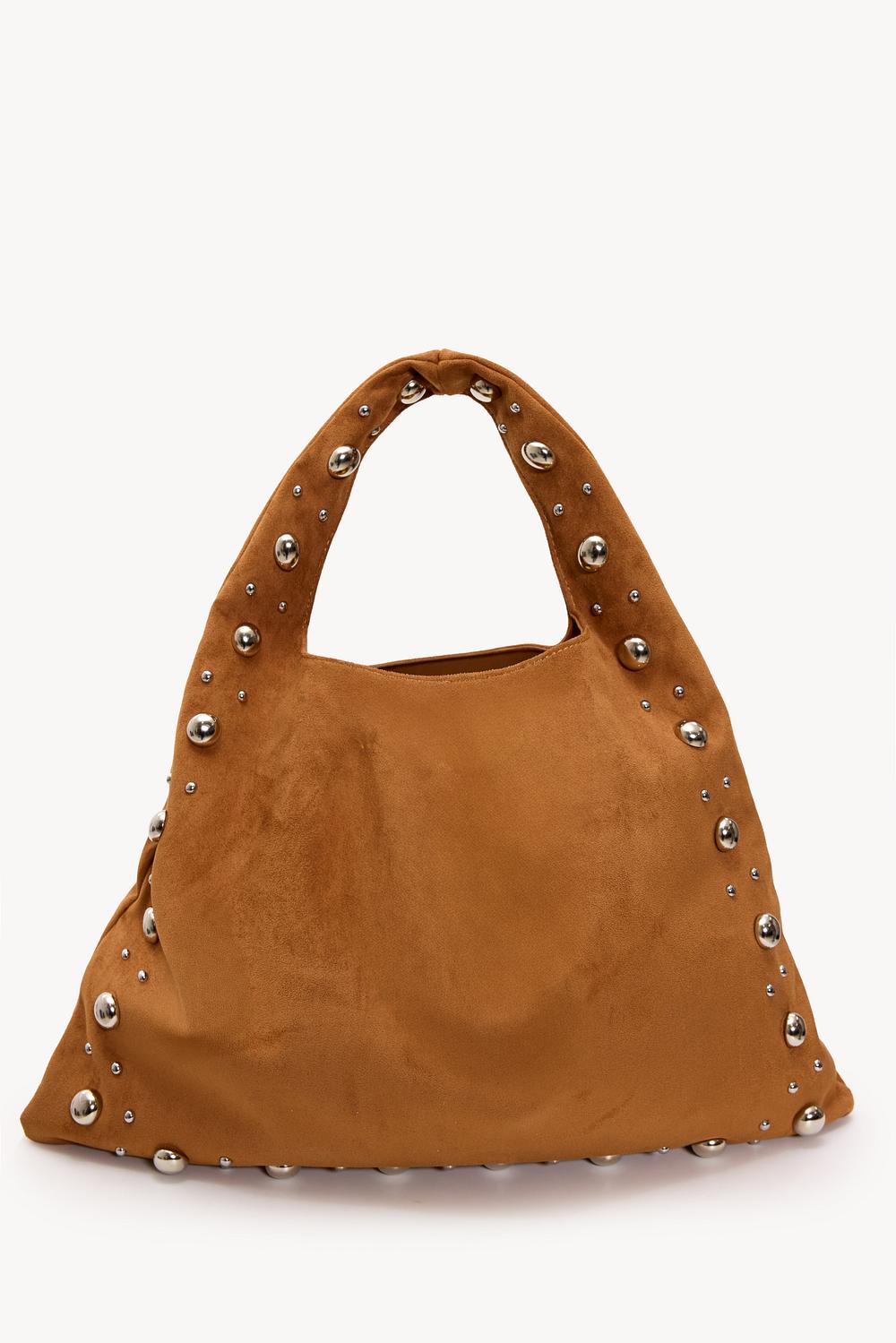 This camel-colored tote bag features striking studs all over for an edgy statement look. The spacious shopper with a suede-like texture offers both comfort and style. The bold stud details give this bag a rock-chic appearance that perfectly matches both casual and dressed-up looks.