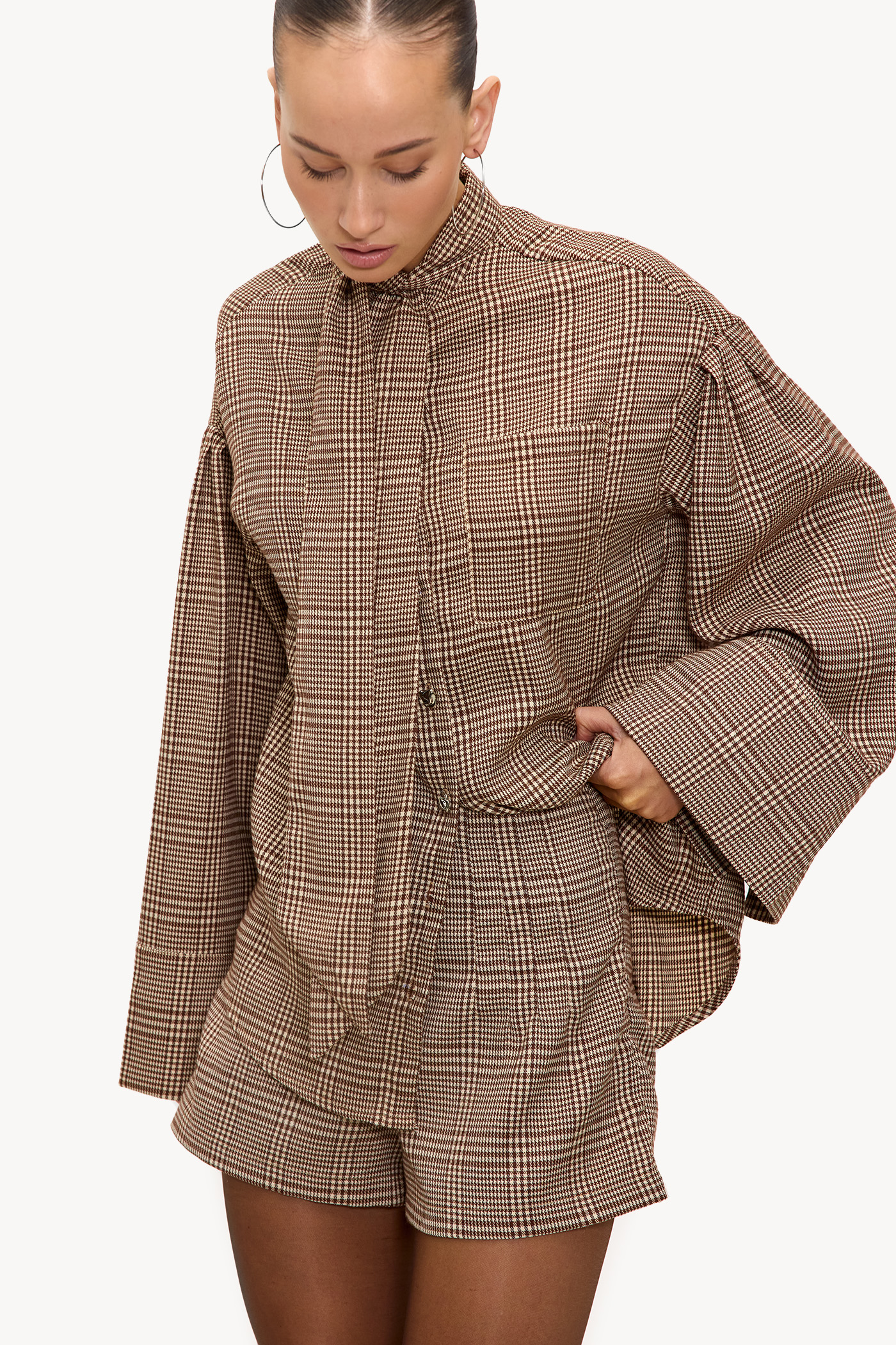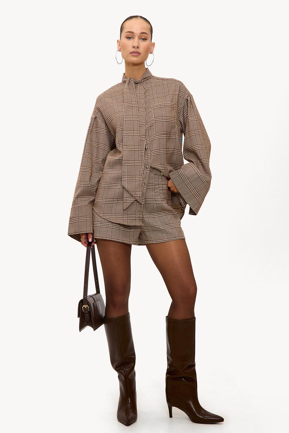 Light brown shorts with check pattern EUR 39.99These brown shorts feature a classic check pattern for a timeless look. The high-waisted fit with wide legs creates a chic appearance. The relaxed fit ensures comfort and freedom of movement. Style these shorts with the matching blouse for a stunning co-ord look.