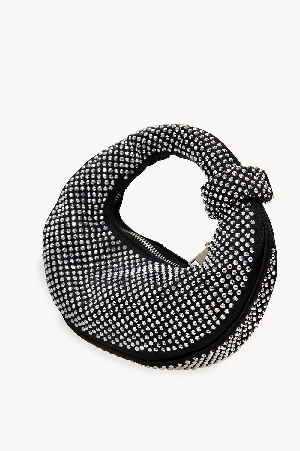 Black bag with rhinestones EUR 39.99This silver handbag features a striking all-over crystal design for a luxurious statement look. The round shape with convenient handles and zipper closure ensures a practical yet glamorous appearance. The shimmering details make this bag perfect for a girls' night out or dinner date. Style this eye-catching accessory with a black outfit for a chic contrast.