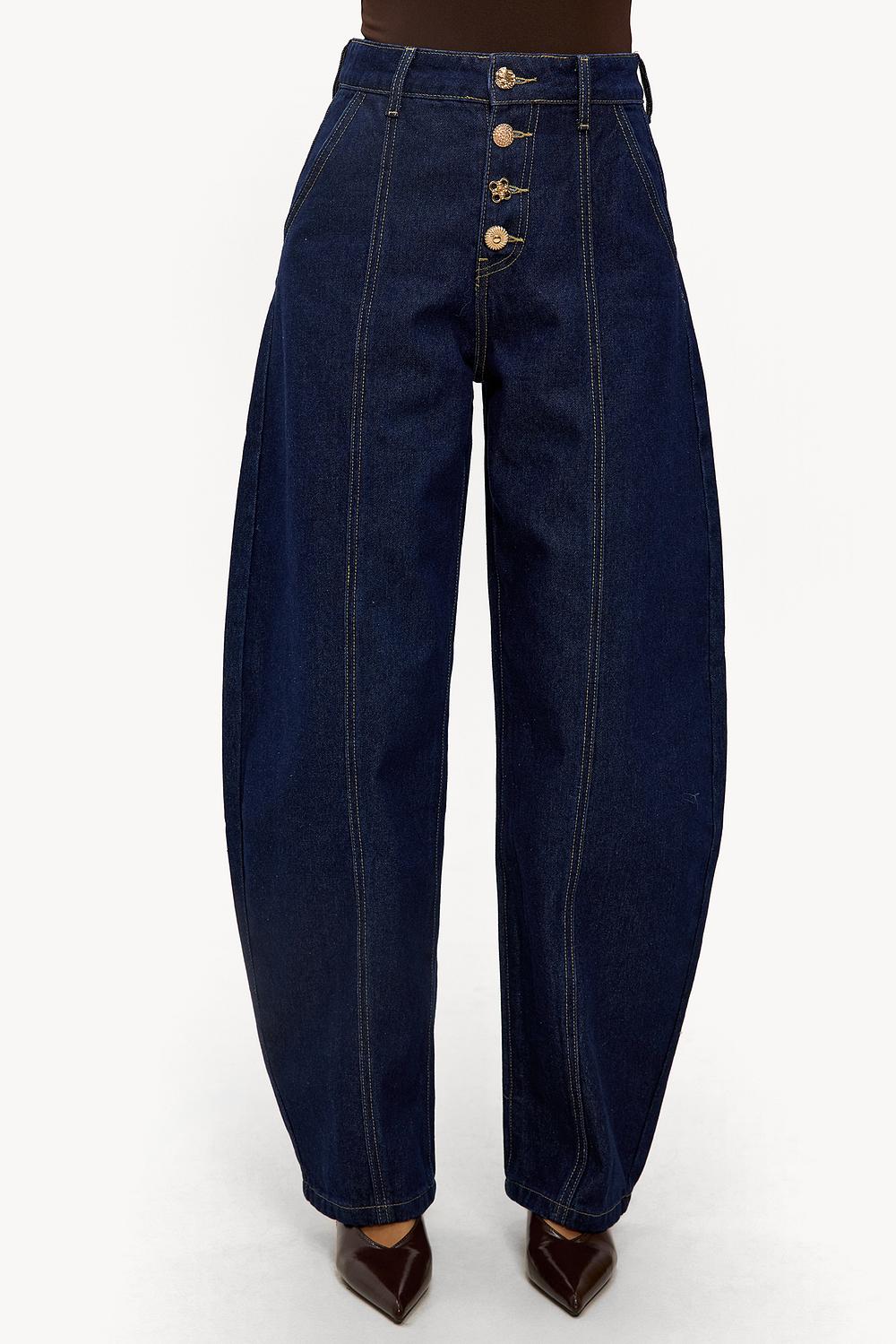 These wide leg jeans feature a striking balloon fit with statement gold buttons at the front. The high-waisted fit with wide legs creates a cool retro vibe. The dark blue denim wash and decorative contrasting stitching give these jeans a vintage touch. Style this statement denim with a white blouse for a chic casual look.
