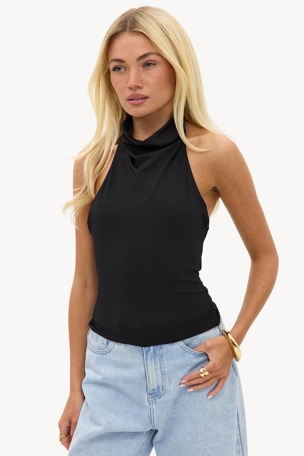 Black top with gold details EUR 19.99This black halter top features a tight bodycon fit with a mock neck design. The backless style with a gold ring detail on the back creates a statement look. The stretchy polyester blend ensures comfort and a perfect shape. Style this top with wide leg jeans for a chic casual outfit.