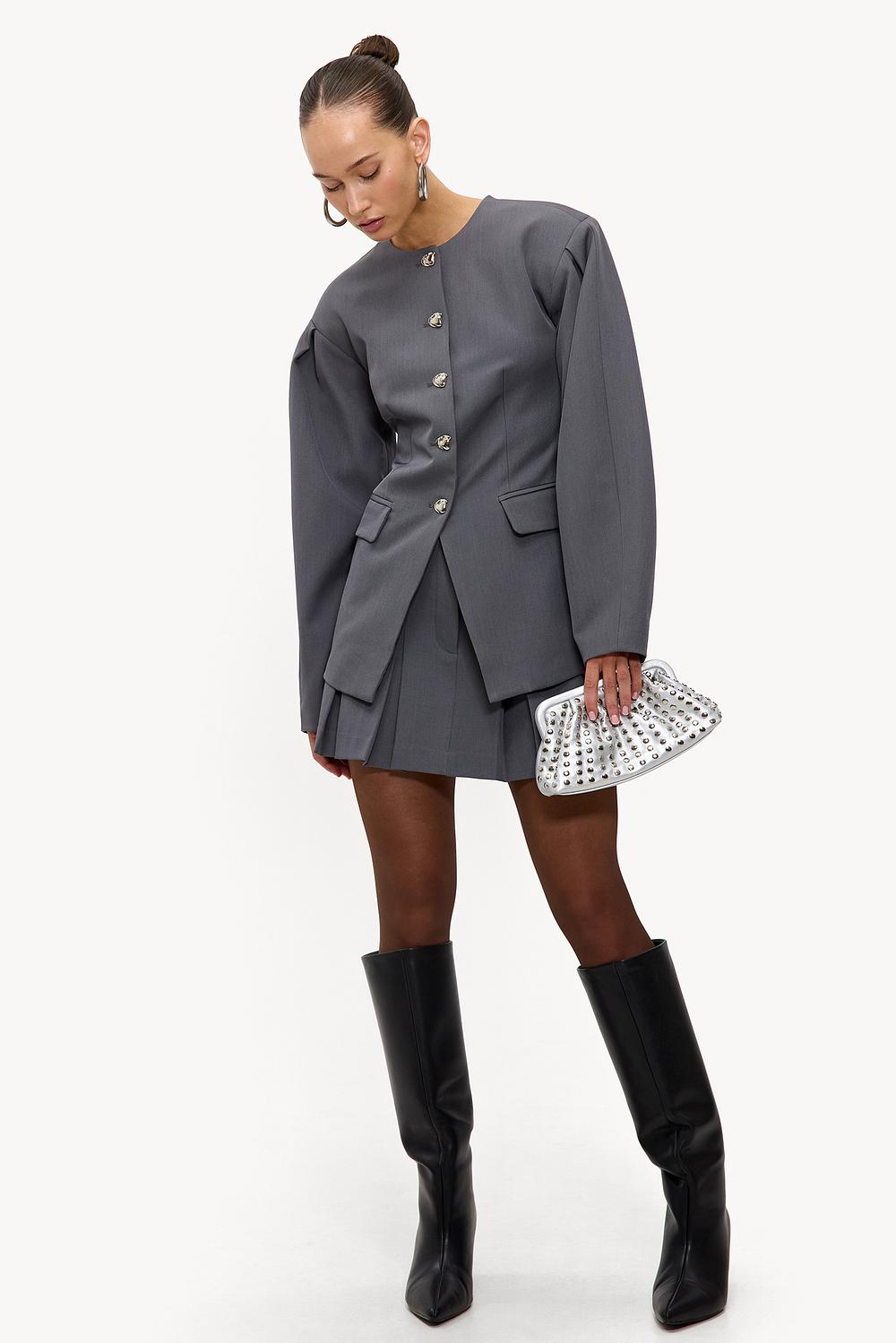 Dark grey blazer with silver buttons EUR 79.99This dark gray blazer features a collarless design with statement gold buttons for a luxurious twist. The tailored fit with subtle shoulder padding and decorative pockets creates a professional appearance. The asymmetrical button closure gives this design an updated look. Style this blazer with wide-leg jeans for office days.