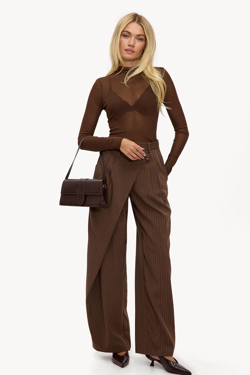 Dark brown mesh top EUR 25.99This brown mesh top features a sheer texture with a mock neck and long sleeves. The bodycon fit with subtle stretch ensures a comfortable fit. The mesh quality creates a sophisticated layering piece that is perfect for combining. Style this top with the matching wide-leg trousers for a chic look.