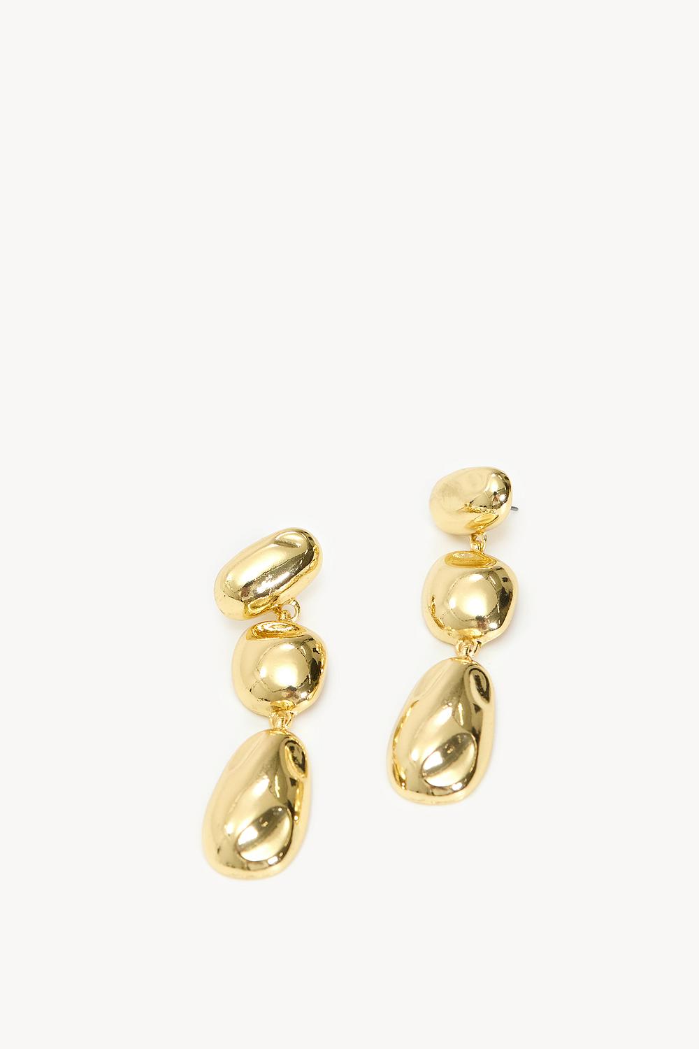 Gold earrings EUR 14.99These gold statement earrings feature a striking design with three organic shapes elegantly connected. The shiny gold-plated finish on stainless steel ensures a luxurious appearance that does not tarnish. The asymmetrical teardrop shape creates movement and catches the light beautifully. Perfect to give your outfit a chic finishing touch.