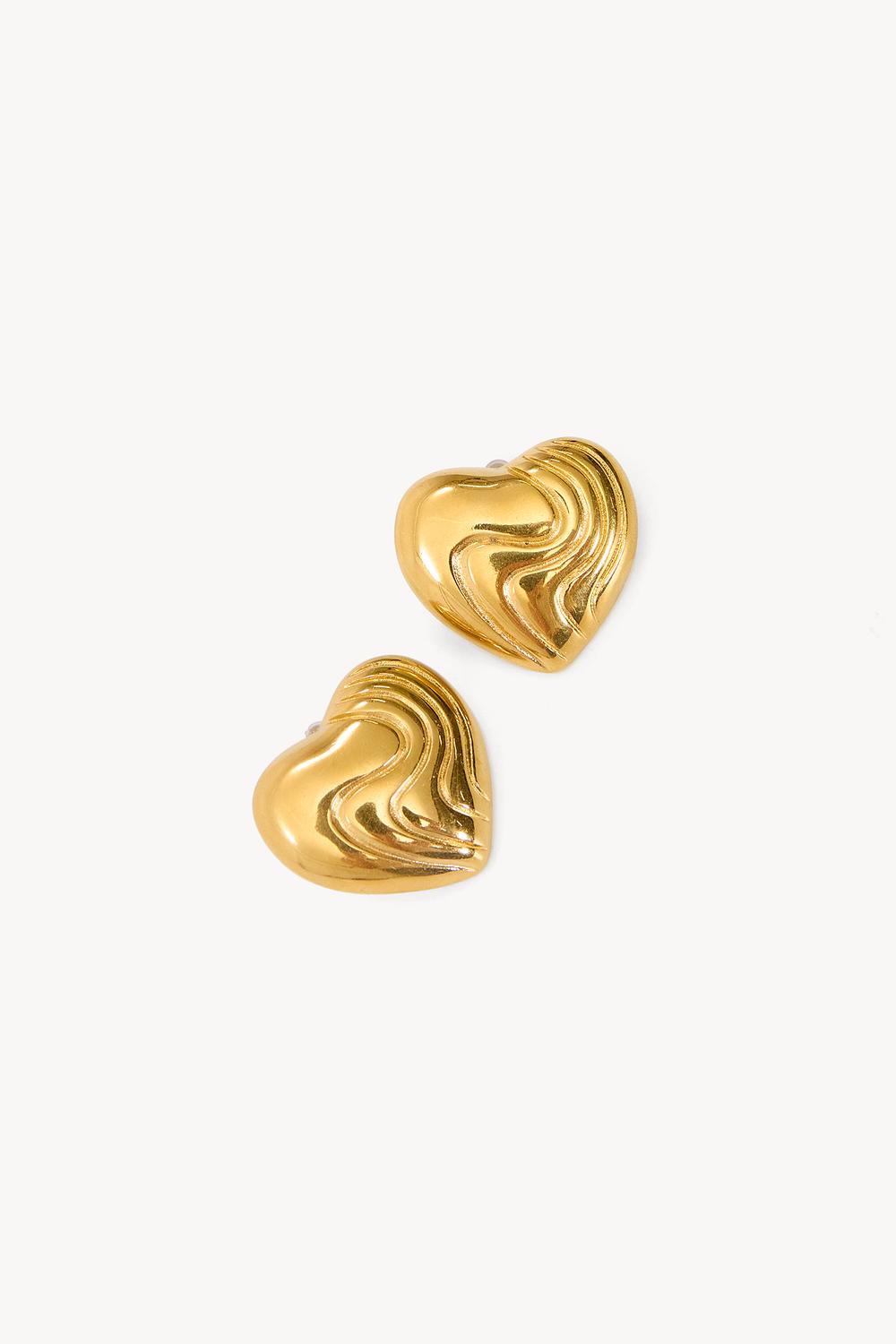 These gold heart studs feature a striking twisted design with subtle textured details. The heart shape with statement twist pattern creates a luxurious look. The high-quality stainless steel gold-plated finish ensures durability and a chic golden finish.