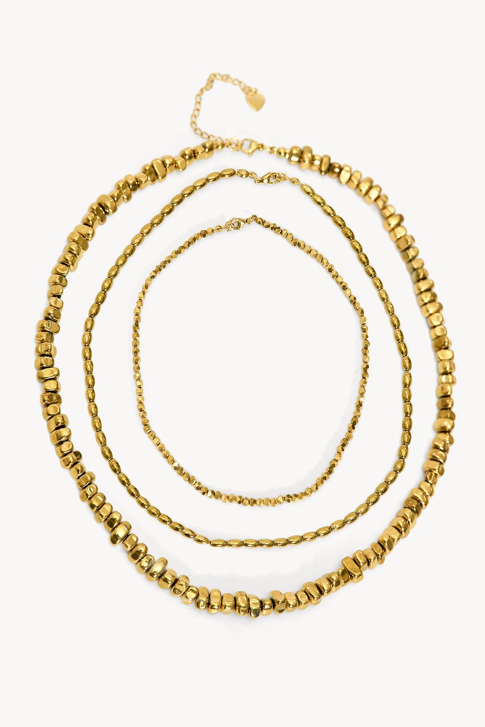 Gold necklace 3-pack EUR 21.99This gold necklace set consists of three different chain designs for a luxurious layered look. Each of the necklaces has a unique texture with different link patterns that are perfectly combinable. The 100% stainless steel quality with gold plating ensures durability and a premium appearance. Style this set with a basic white tee and oversized blazer for an effortless chic look.