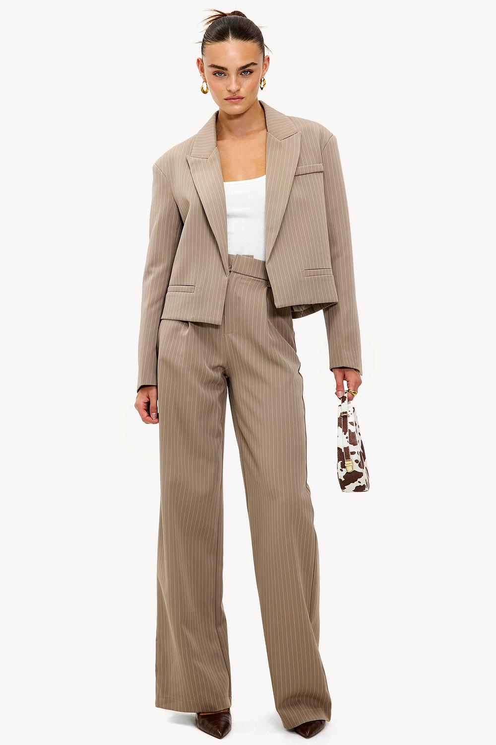 This taupe blazer features a chic pinstripe pattern for a professional appearance. The tailored fit with classic lapels and front pockets creates a timeless look. The blazer is perfect to pair with the matching wide-leg trousers for a complete office look. Style this blazer separately over a basic top and jeans for a smart casual look.