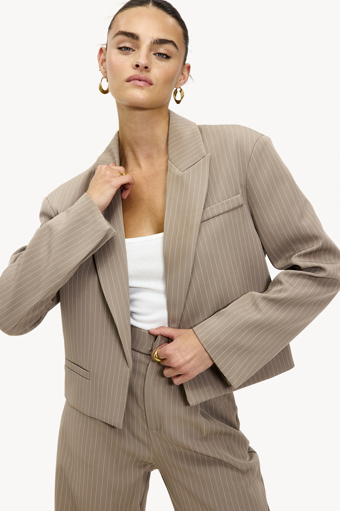Taupe blazer with stripes EUR 59.99This taupe blazer features a chic pinstripe pattern for a professional appearance. The tailored fit with classic lapels and front pockets creates a timeless look. The blazer is perfect to pair with the matching wide-leg trousers for a complete office look. Style this blazer separately over a basic top and jeans for a smart casual look.