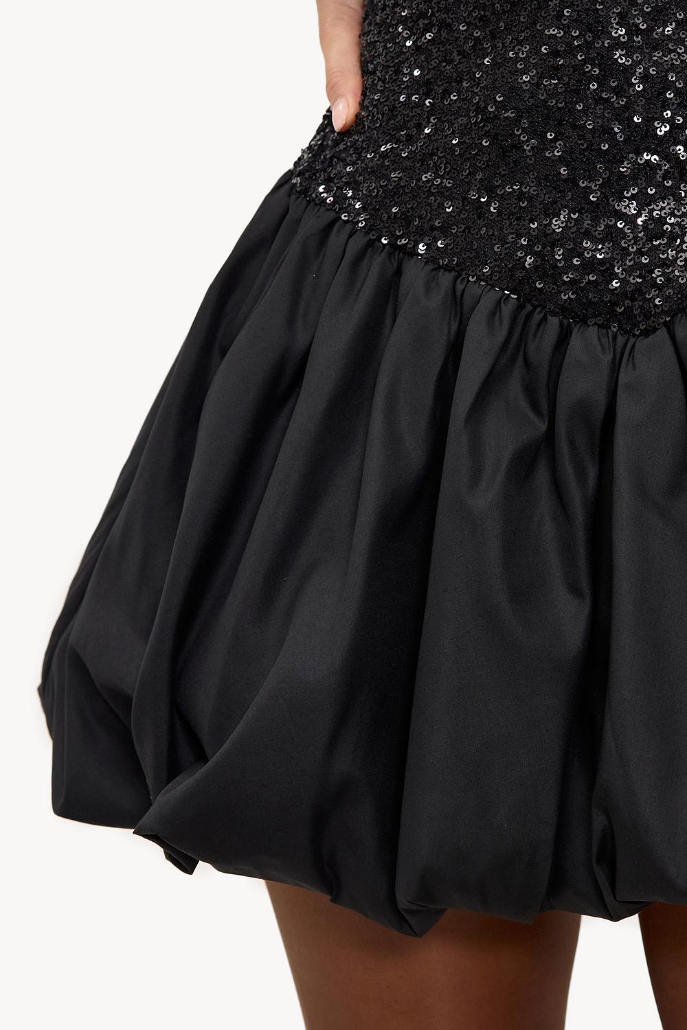 This black mini dress features a luxurious sequin top that perfectly contrasts with the voluminous skirt. The bodycon fit with long sleeves and draped skirt creates a stunning party look. The combination of shimmer details and statement volume makes this dress perfect for a girls' night out.