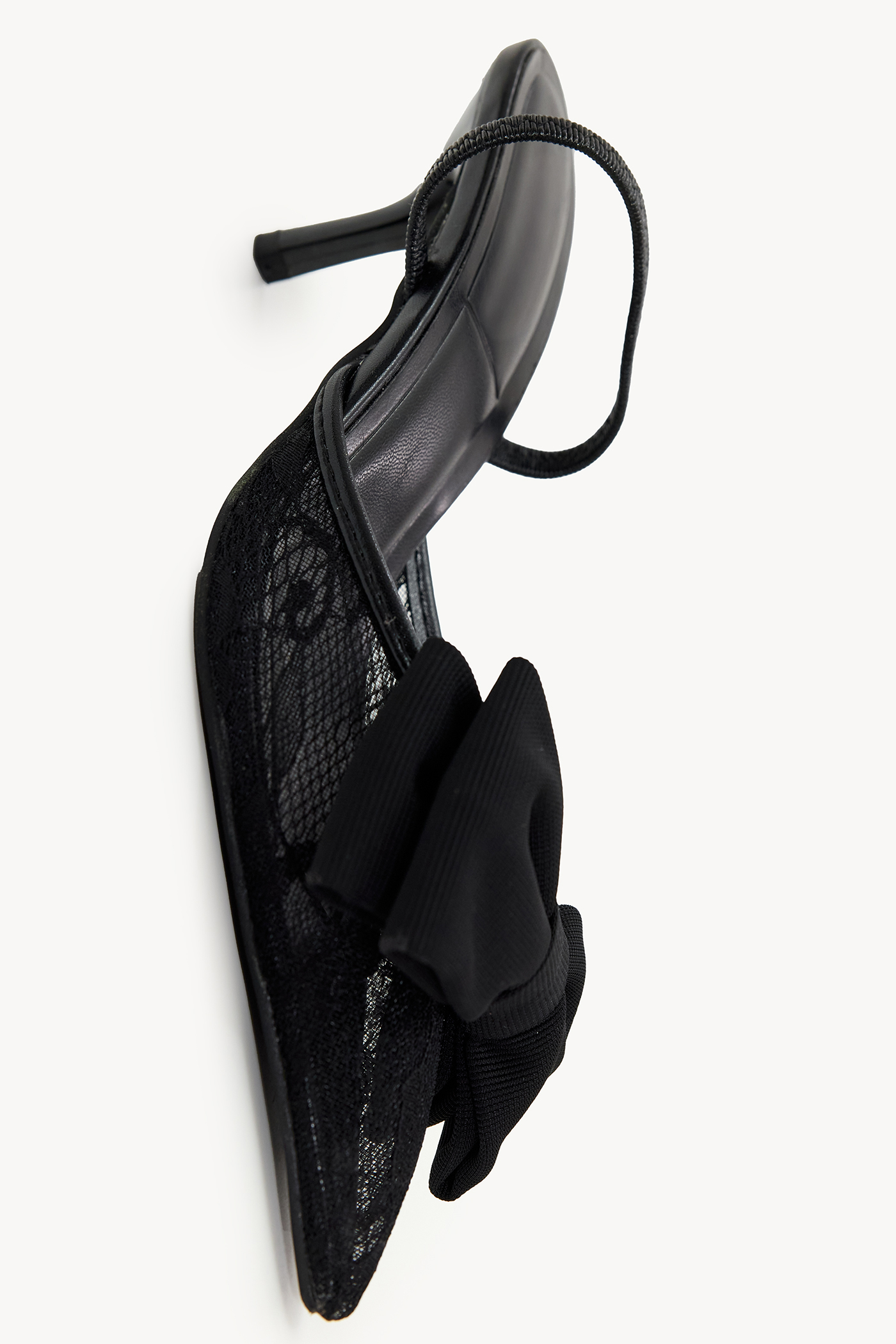 Black heels with lace and bow EUR 39.99These black pumps feature a luxurious lace design with a statement bow detail for a chic look. The pointed toe and ankle strap give these shoes a modern twist. The subtle heel ensures comfort and an elegant appearance. Style these pumps with a black mini dress for a dinner date look.