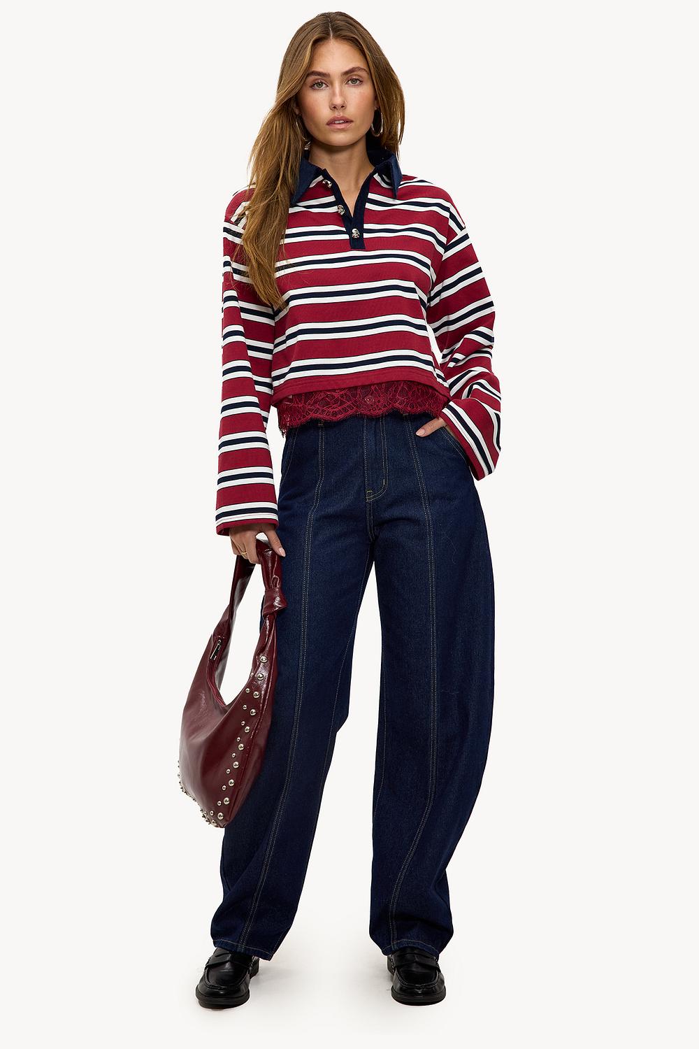 Red striped polo shirt with lace detail EUR 49.99This red striped long sleeve has a classic rugby design with contrasting white and dark blue stripes. The relaxed fit with collar creates a casual chic look. The lace details at the bottom give this top a cool twist. Style this long sleeve with wide leg jeans for an effortless weekend outfit.