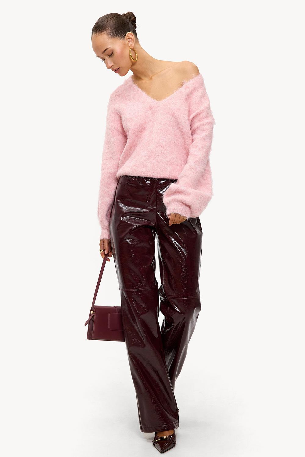 Pink sweater EUR 49.99This pink knit sweater features a soft melange texture for a luxurious look. The oversized fit with deep V-neck and balloon sleeves creates a chic casual look. The wool blend provides extra comfort and warmth. Style this jumper with leather-look trousers for an edgy contrast.