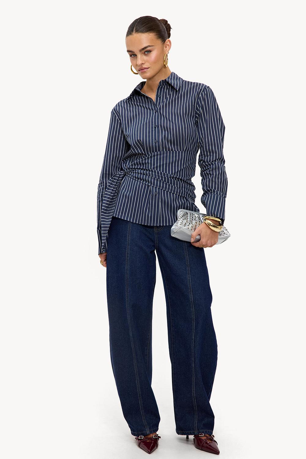 Dark blue striped blouse EUR 49.99This navy blouse features a classic pinstripe print and a tailored fit with a tie belt. The button closure and long sleeves give a professional appearance, while the tie details add a feminine touch. The cotton blend ensures comfort and a luxurious look. Style this blouse with wide-leg jeans for a chic office look.