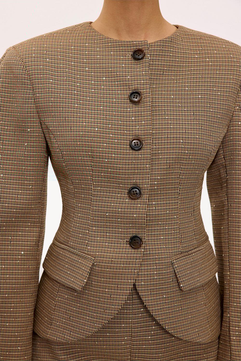 Light brown jacket with check pattern and rhinestones EUR 79.99This brown checked blazer has a tailored fit with statement button closure at the front. The fitted shape with subtle shoulder pads and decorative pockets creates a chic business look. The light brown check print gives this blazer a classic twist. Style this blazer with the matching shorts for a power co-ord look.