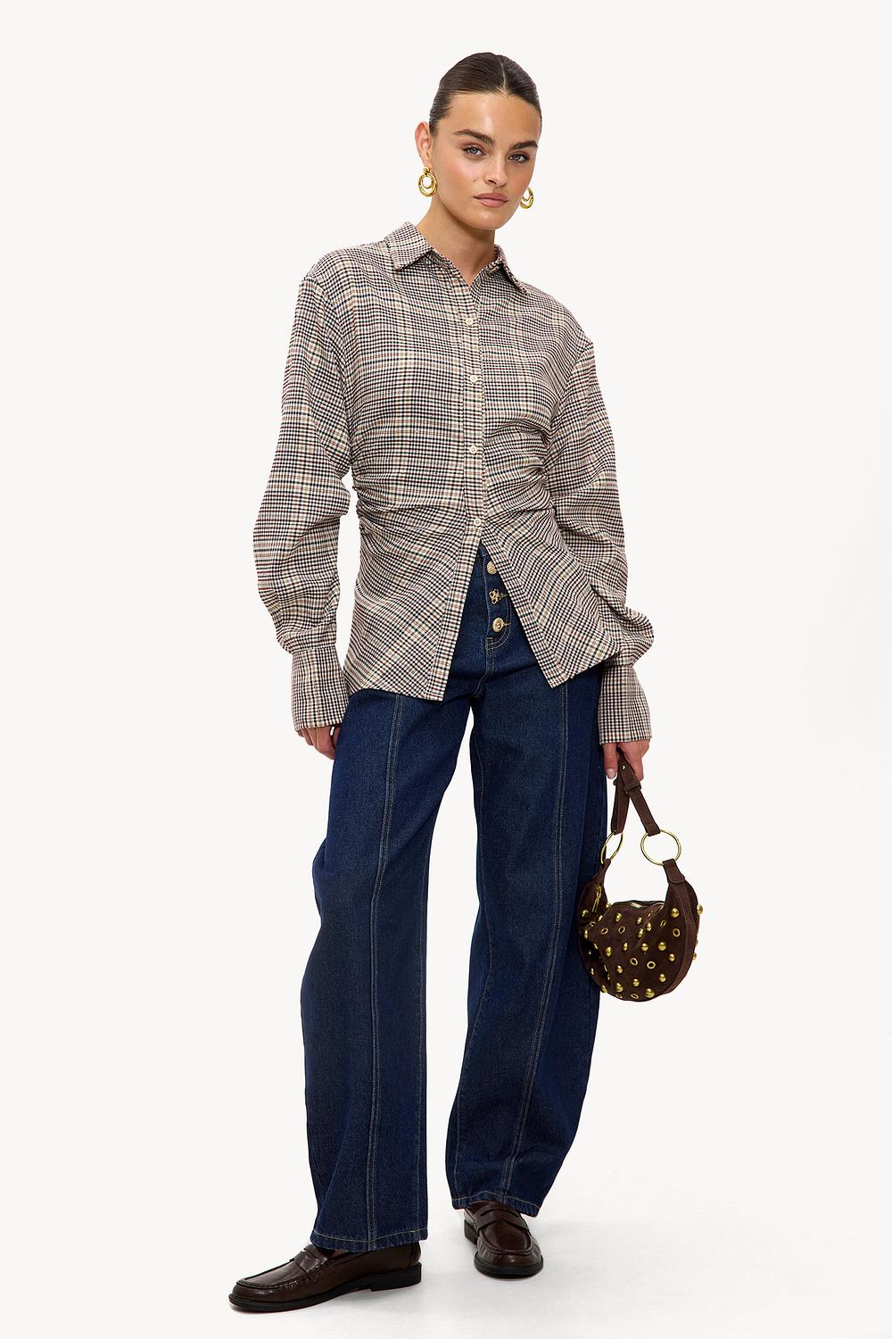 Beige checked blouse with rhinestones EUR 49.99This beige checked blouse features an oversized fit with a statement bow detail at the front. The classic collar and button closure give a timeless touch to the design. The wrap detail at the waist creates a beautiful shape and accentuates the fit. Style this blouse with wide-leg jeans for a chic casual look.