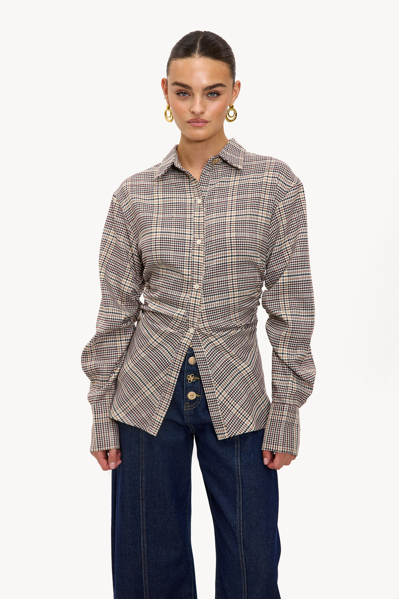 This beige checked blouse features an oversized fit with a statement bow detail at the front. The classic collar and button closure give a timeless touch to the design. The wrap detail at the waist creates a beautiful shape and accentuates the fit. Style this blouse with wide-leg jeans for a chic casual look.